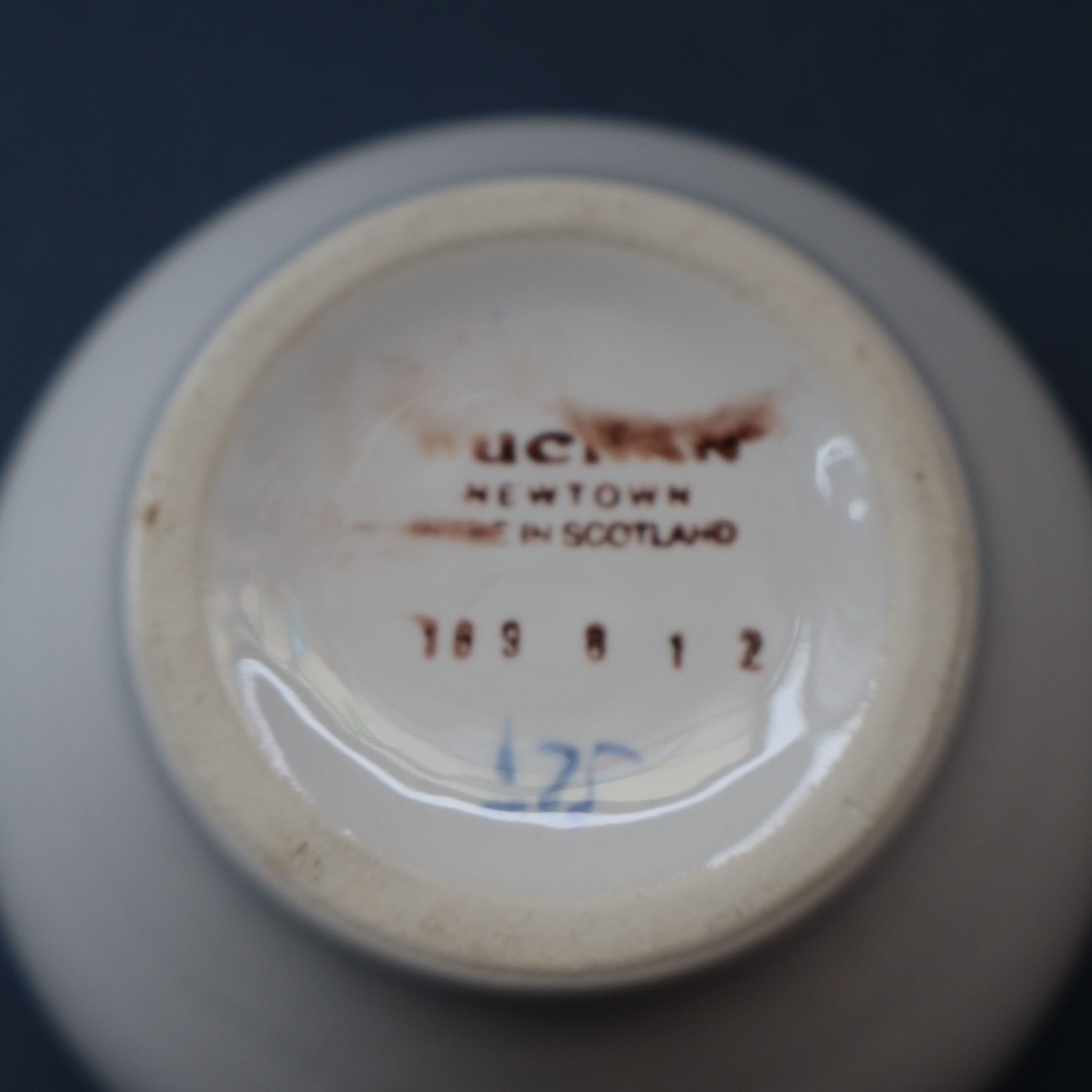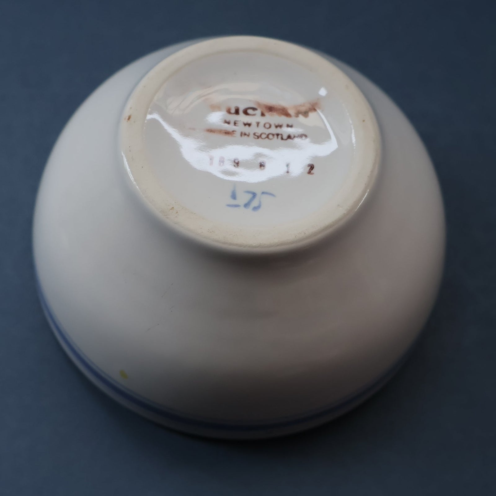 The pattern is a late one, probably produced after the Portobello factory closed in 1972 and manufacturing moved to Crieff. The backstamp as no reference to it being made at Portobello or the factory being A. W. Buchan & Co. Also the style of the decoration seems to suggest a date of around the mid 1980s which would fit with it being made at Crieff. (Just to confuse things Buchan did continue of use a backstamp with Portobello on it when they were at Crieff!).