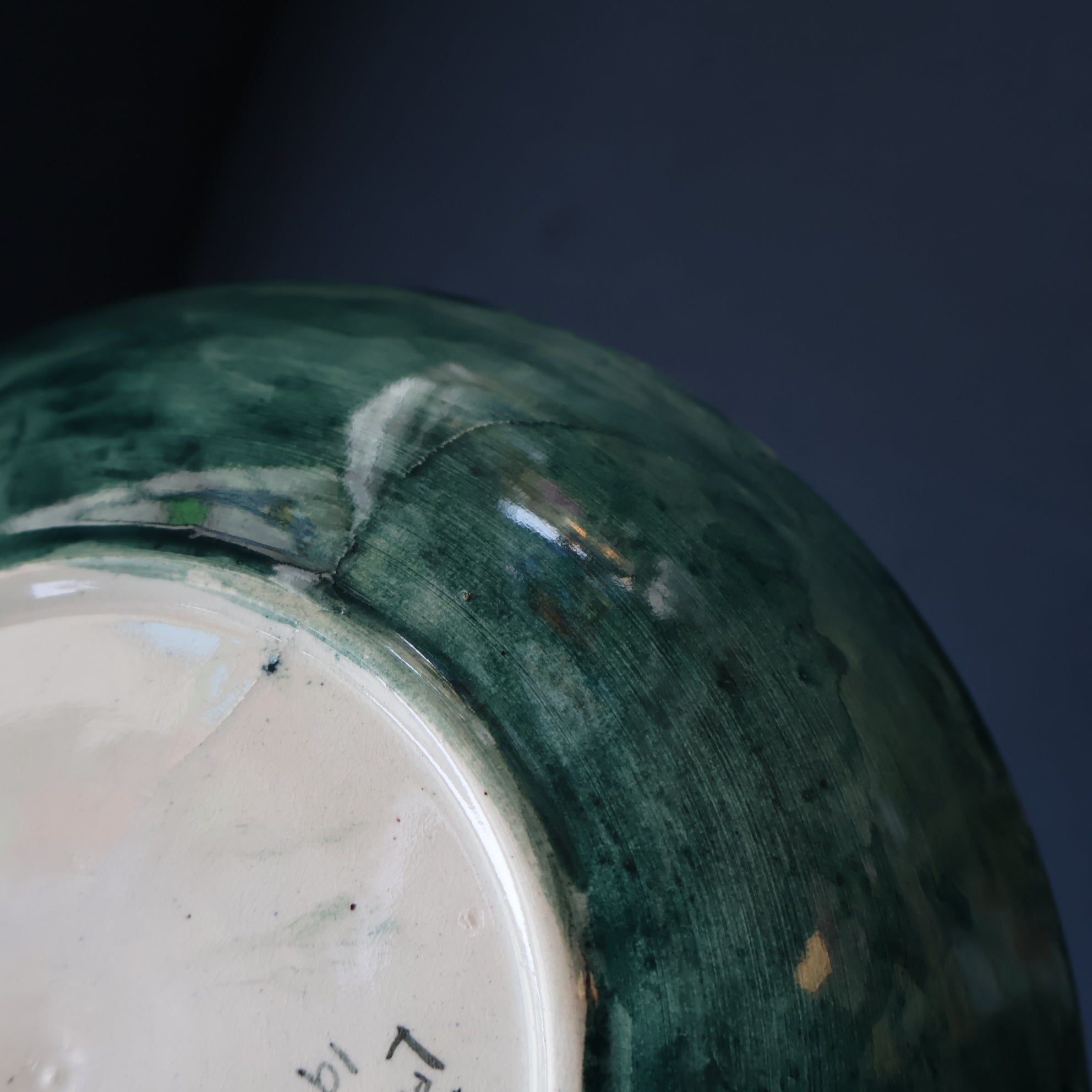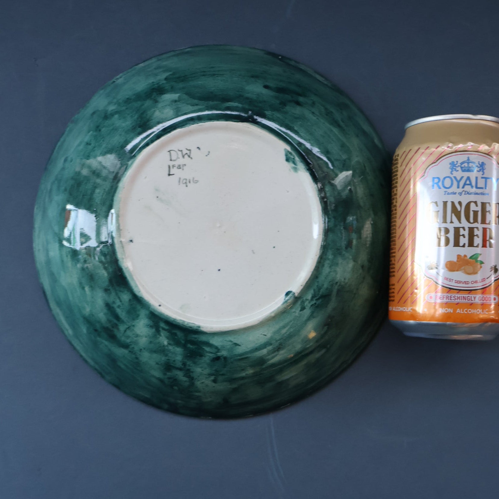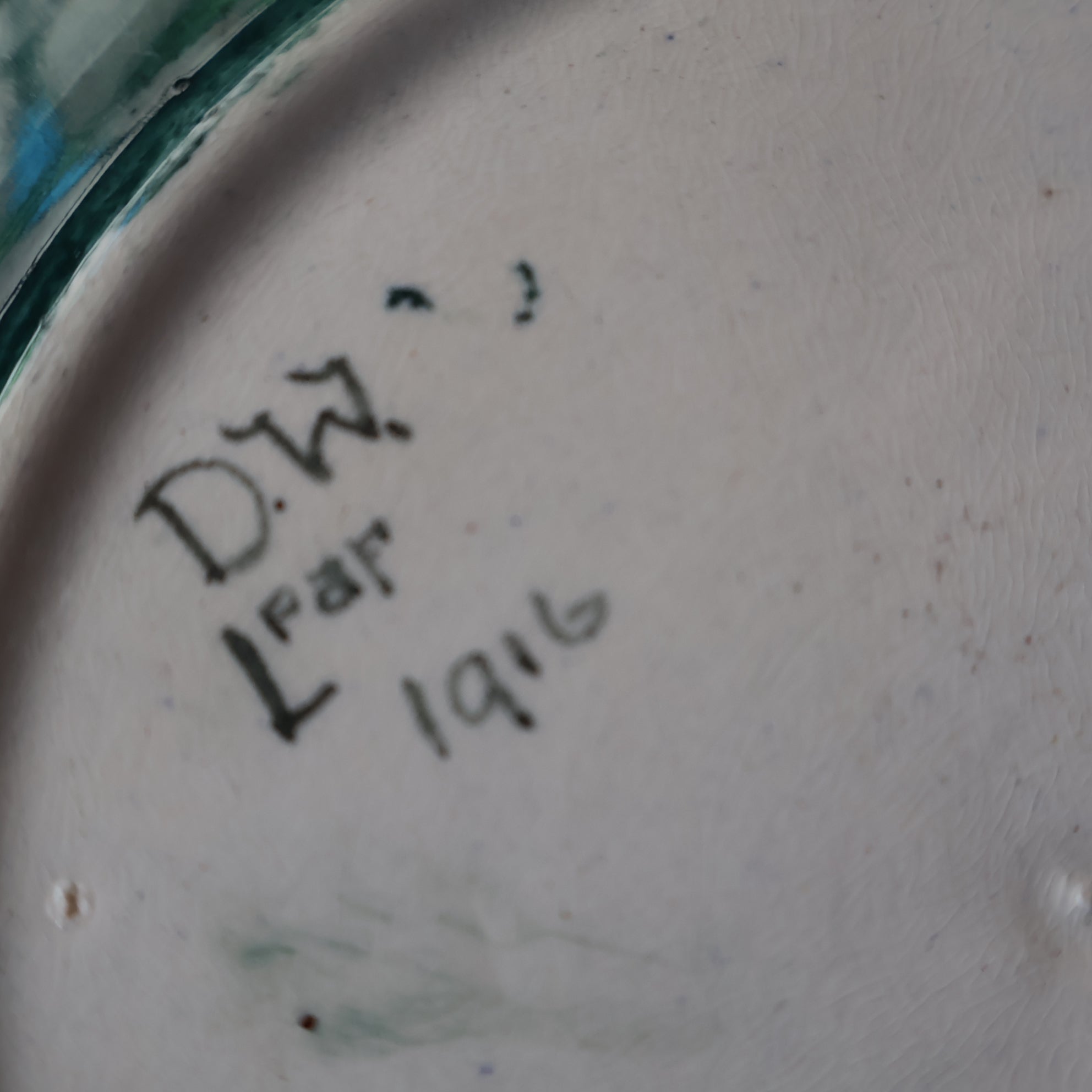 The decoration is painted onto a blank - which has probably been supplied by an English pottery, It was common in the early 20th century for small Scottish potteries to have white ceramics supplied and decorators would paint the decoration on the blanks. Sadly the quality of the ceramic plate is not as good as the painting on it - it does not give a nice ring when gently tapped. On close up inspection there seems to be a flaw in the original blank - and Dolly has ignored this and painted and glazed over it. Perhaps in the middle of WWI it was difficult to get a hold of these blanks from Newcastle - and each one was used regardless of any flaws? I have photographed this area for your inspection - and the last photo probably is the clearest one of the issue with the original blank bowl.
