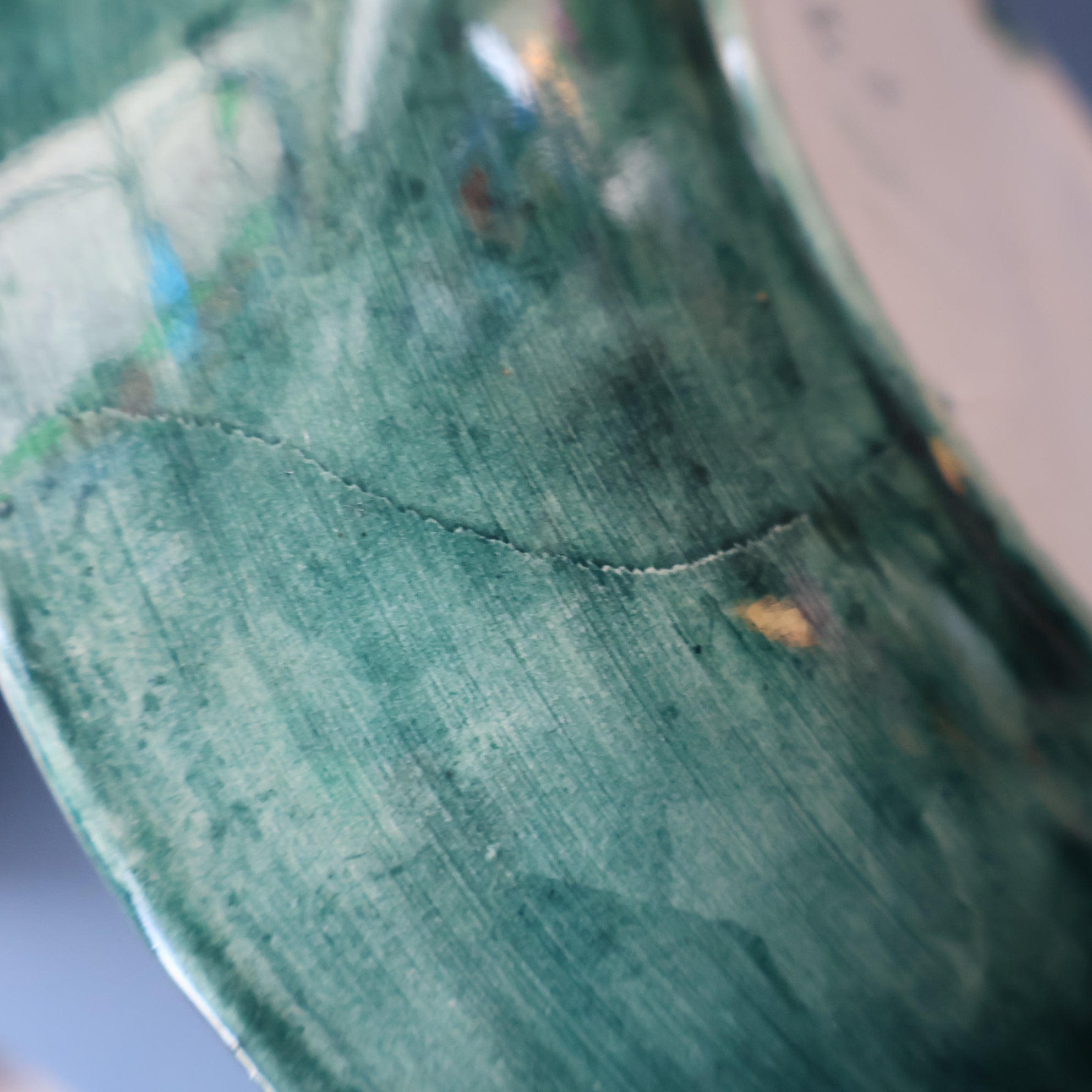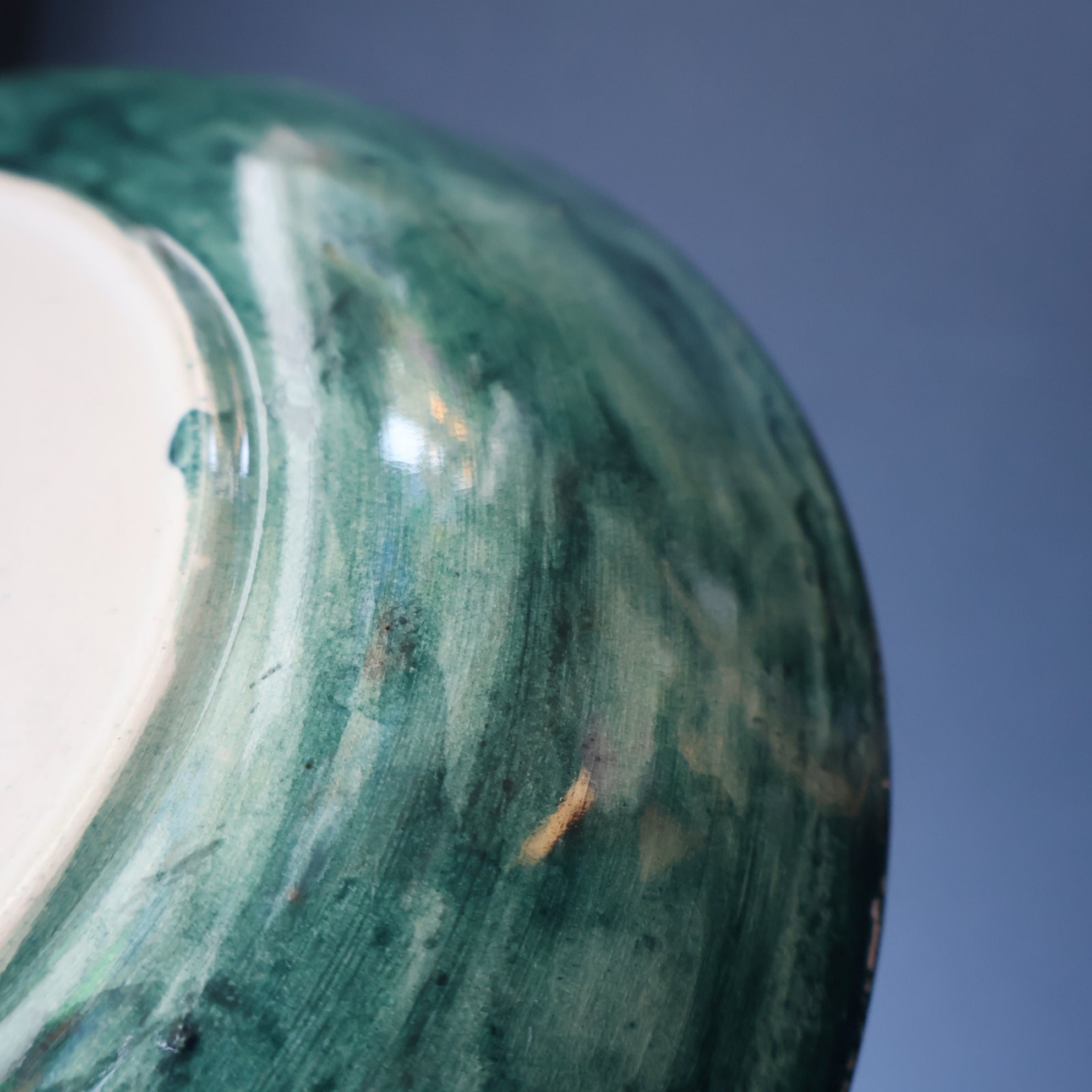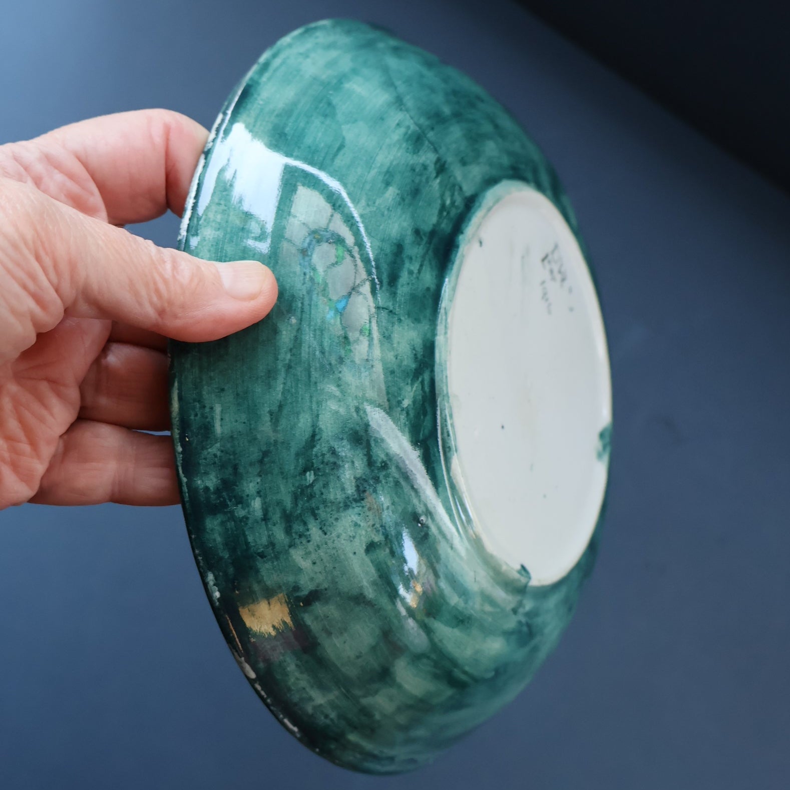 The decoration is painted onto a blank - which has probably been supplied by an English pottery, It was common in the early 20th century for small Scottish potteries to have white ceramics supplied and decorators would paint the decoration on the blanks. Sadly the quality of the ceramic plate is not as good as the painting on it - it does not give a nice ring when gently tapped. On close up inspection there seems to be a flaw in the original blank - and Dolly has ignored this and painted and glazed over it. Perhaps in the middle of WWI it was difficult to get a hold of these blanks from Newcastle - and each one was used regardless of any flaws? I have photographed this area for your inspection - and the last photo probably is the clearest one of the issue with the original blank bowl.