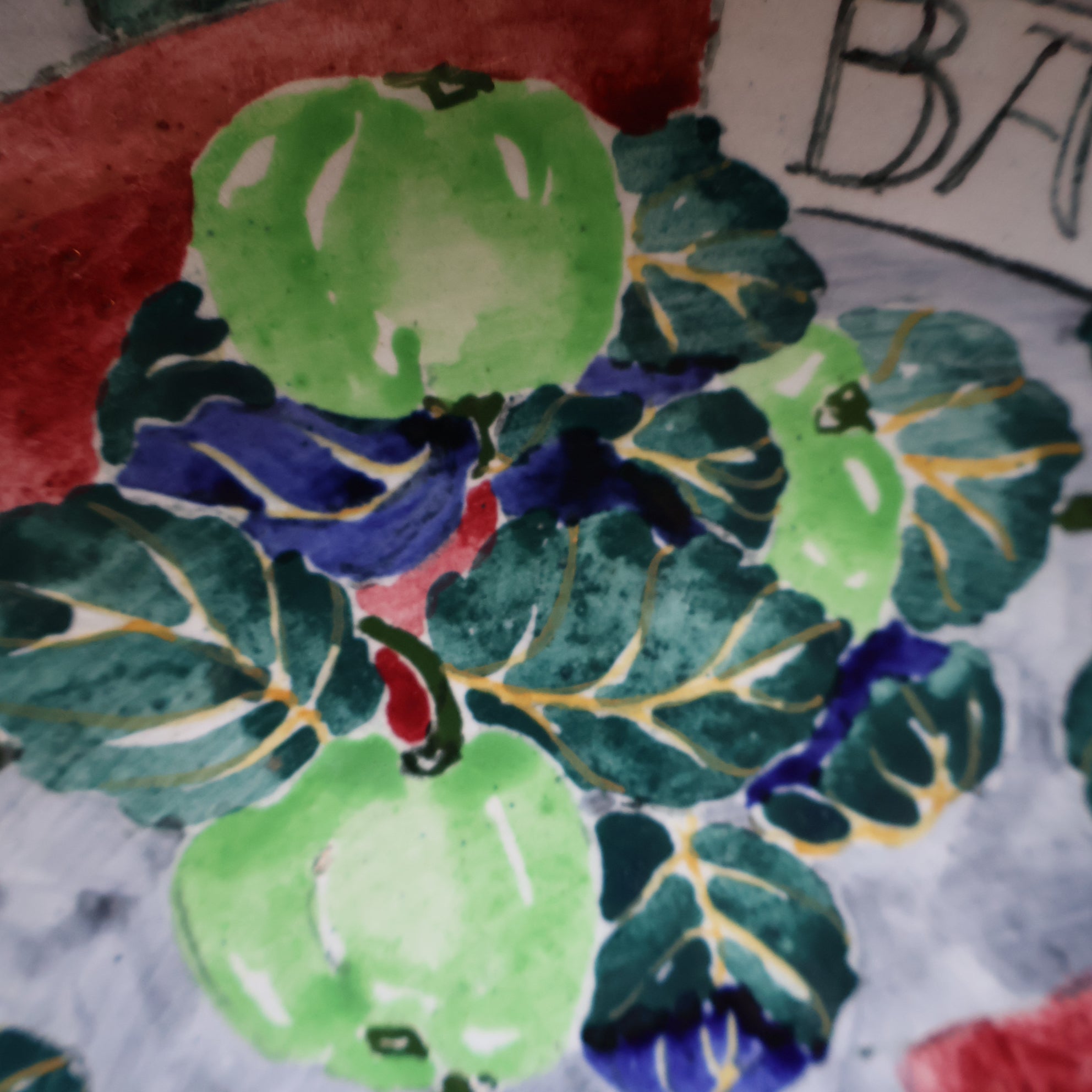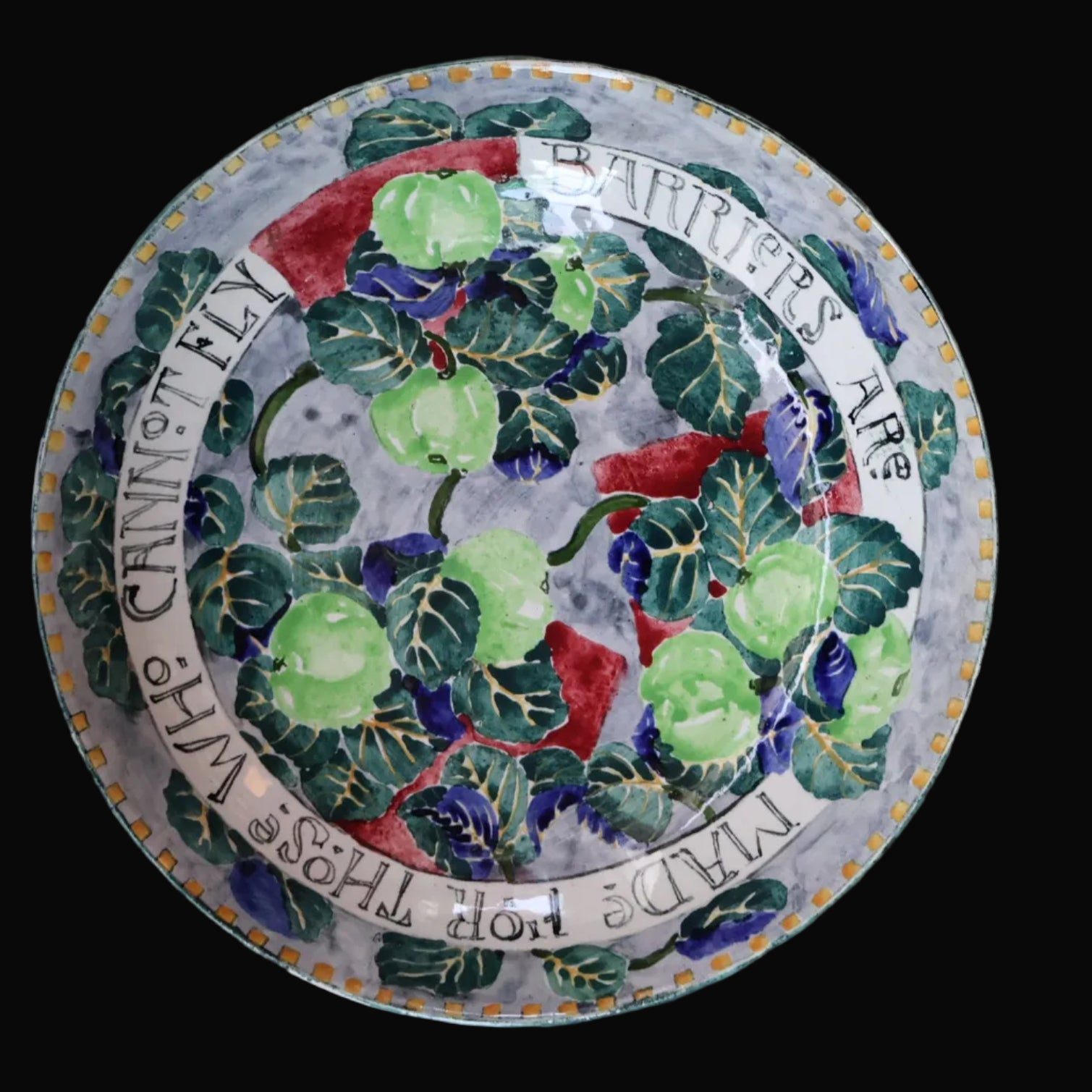 The painted decoration certainly reveals the influence of Bough artwork in the design. The main background colour is a lilac grey and this is embellished with green and blue toned leaves and lime green apples - with are also a couple of patches of a wine red colour. There are little dots of yellow running around the rim. The back is all quickly hand-painted in mottled green - with the base unpainted. The thing that is particularly attractive and indeed collectable about this plate is the motto that is painted around the rim. This read: BARRIERS ARE MADE FOR THOSE WHO CANNOT FLY.