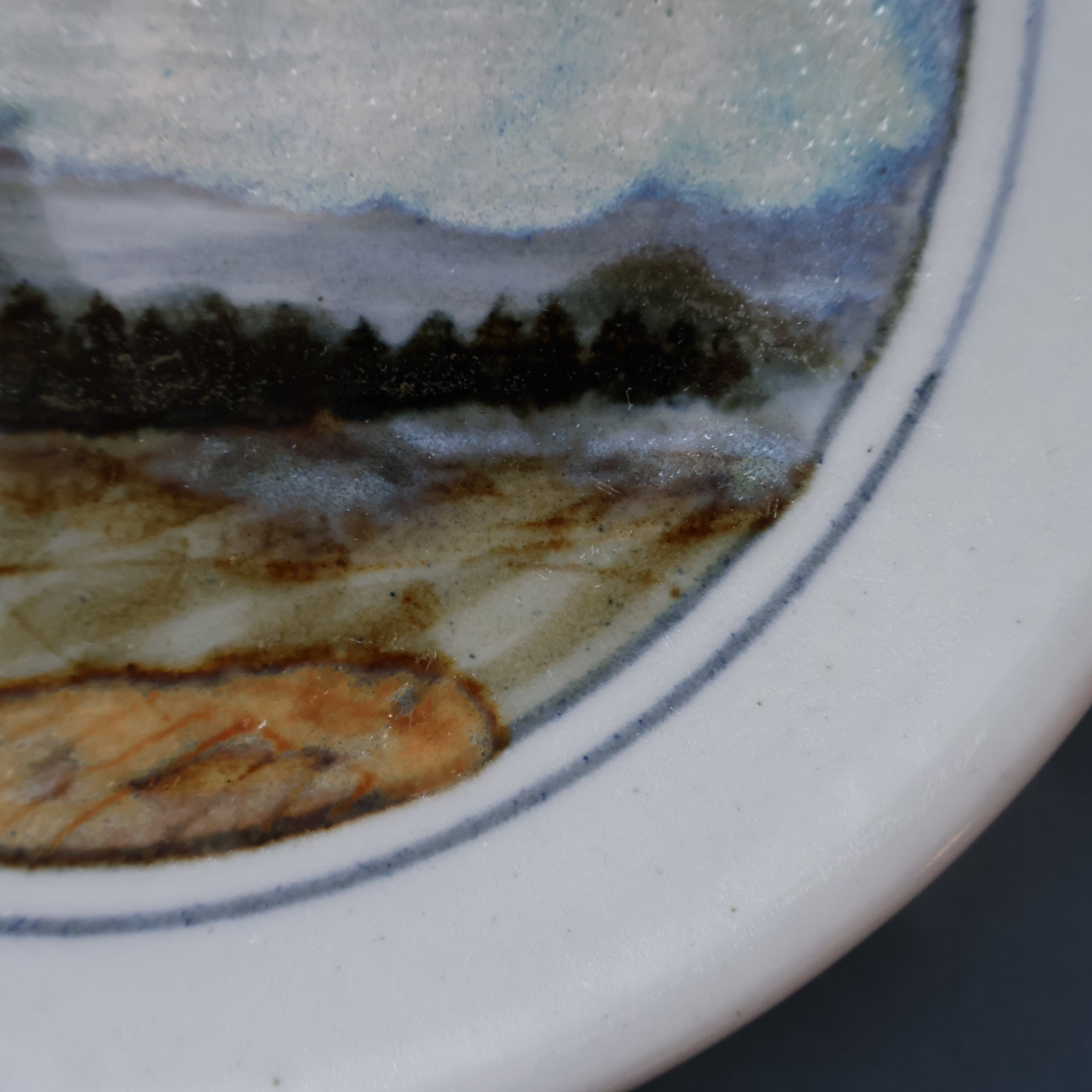 It takes the form of a little decorative plate that has been hand-painted with a pretty image of a Highland Landscape. On the horizon you can see the peaks of a range of hills. In the foreground are wood and a large field. Two big blustery clouds float in the sky. There is a little black dots (front the painter's brush) near the rim, as photographed.
