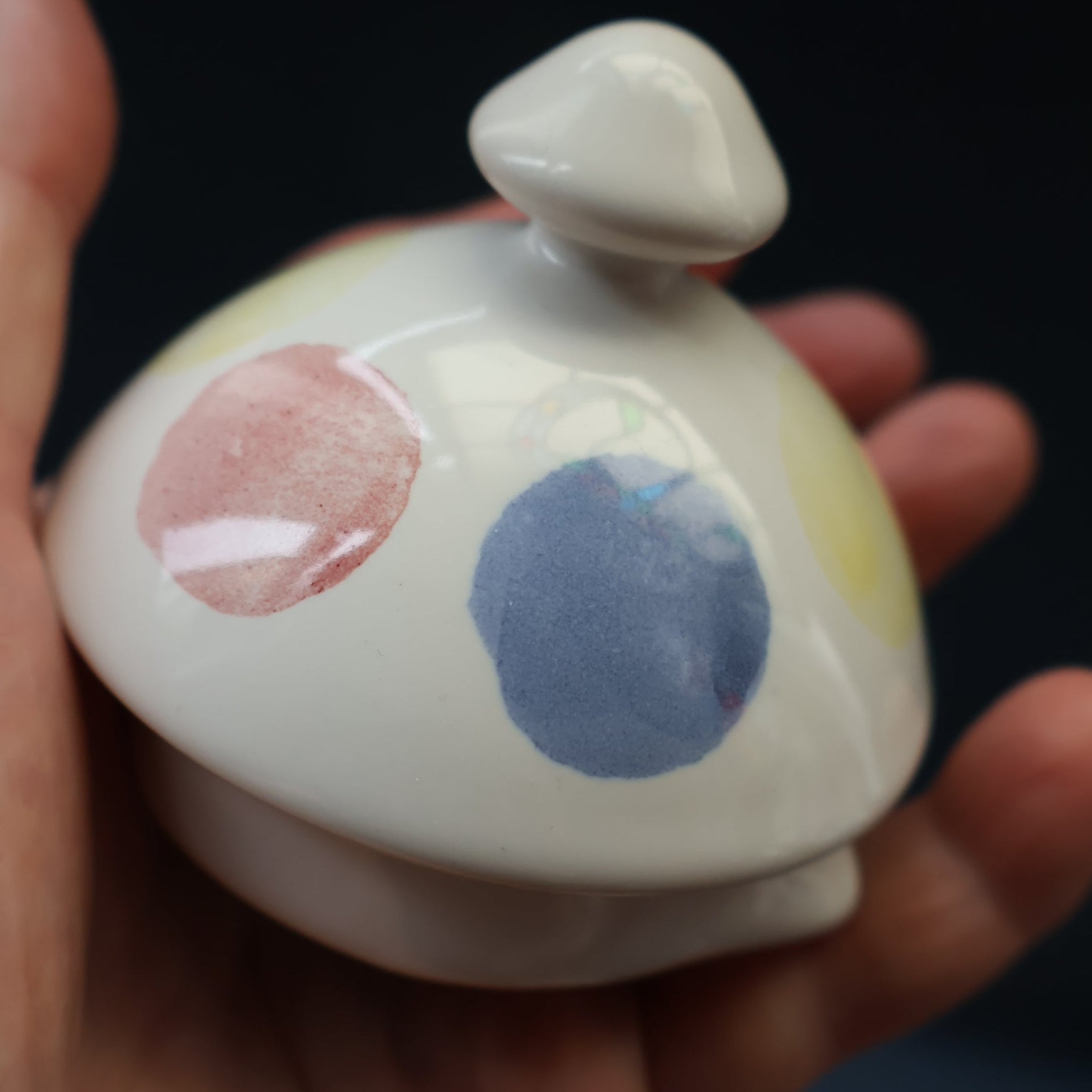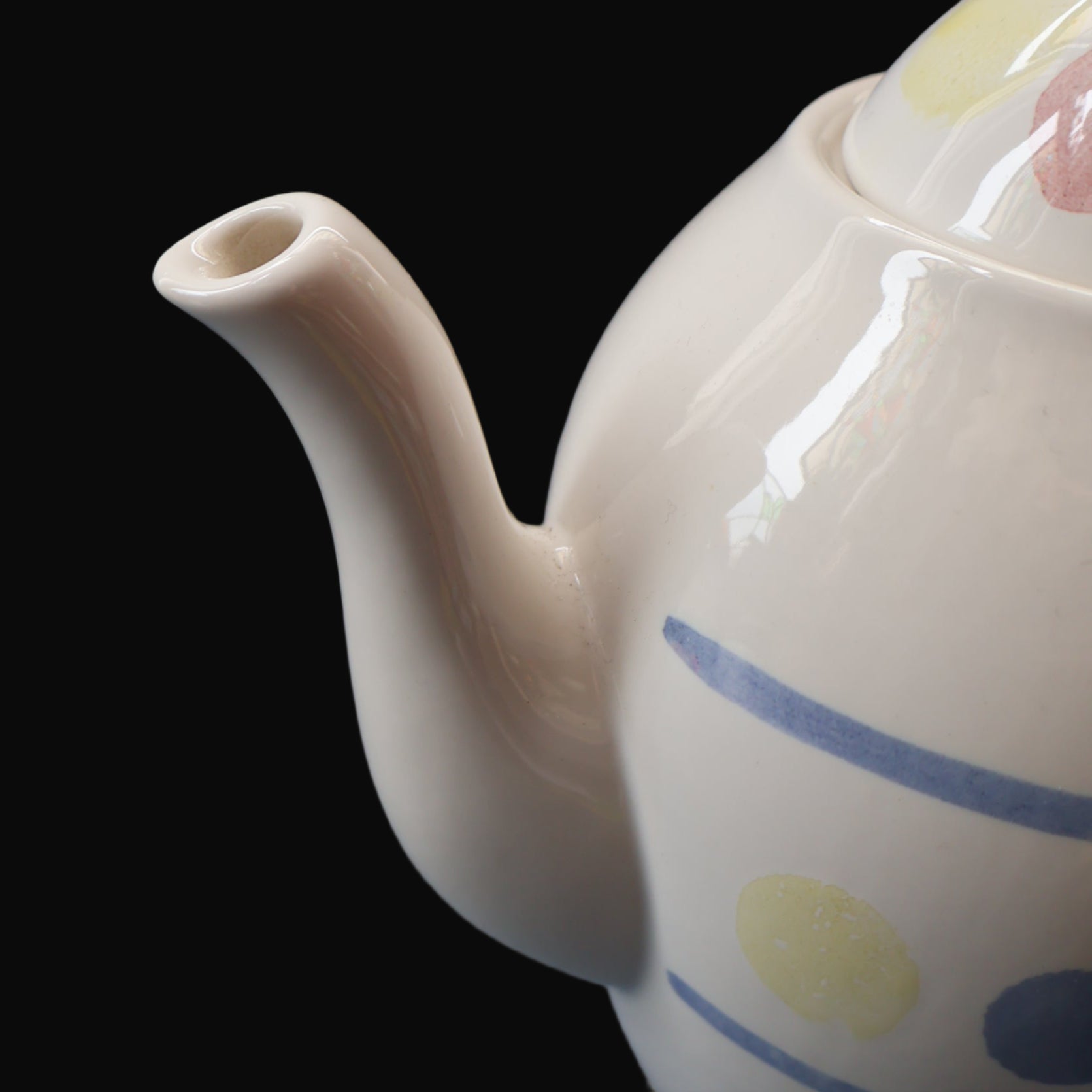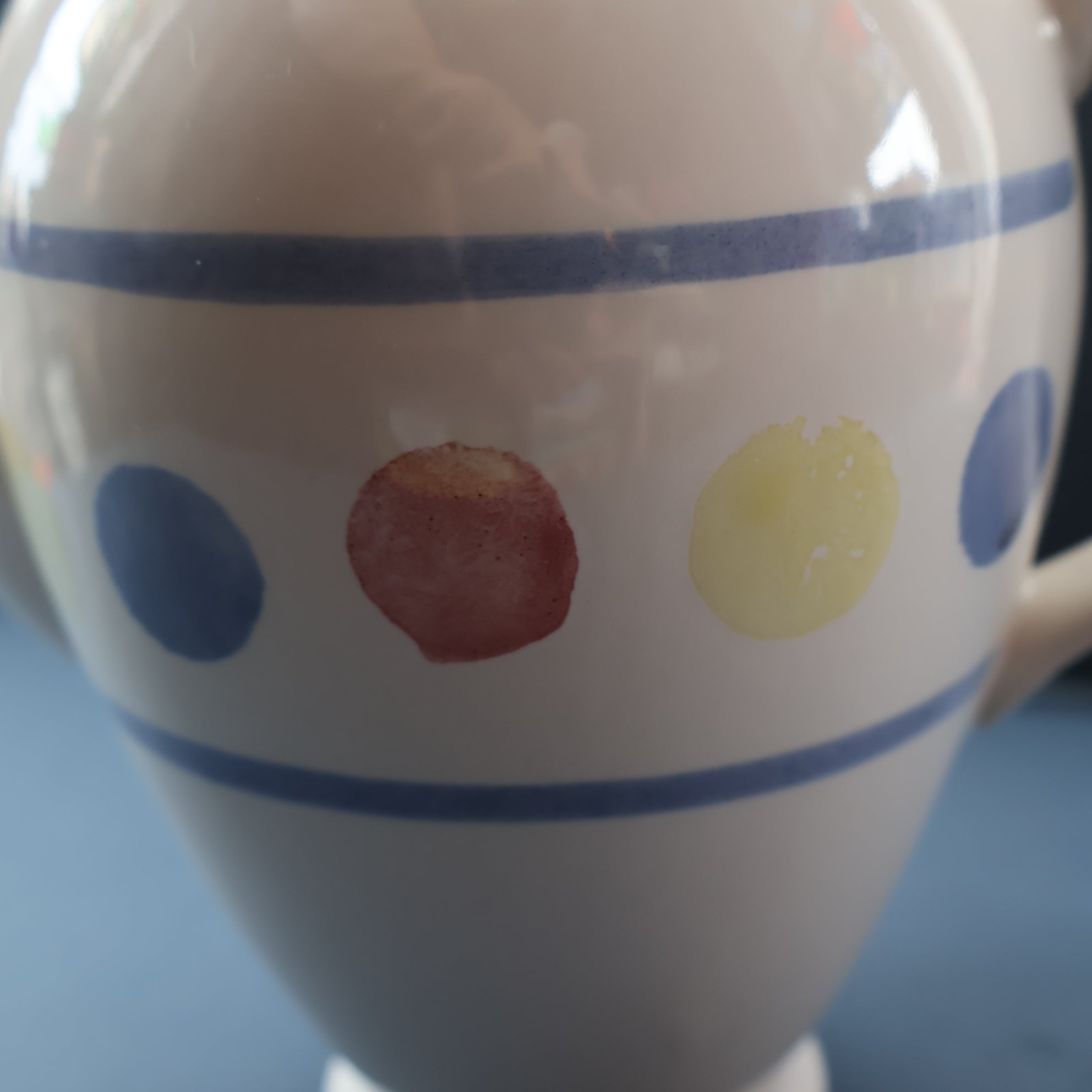Anyway, this substantial ceramic coffee pot seems to be a rare piece and these do not seem to have been produced in large numbers. The glaze is a simple white on and the decoration is applied spongeware large dots, all hand applied - as some are smudged. The pattern is called "New Town".