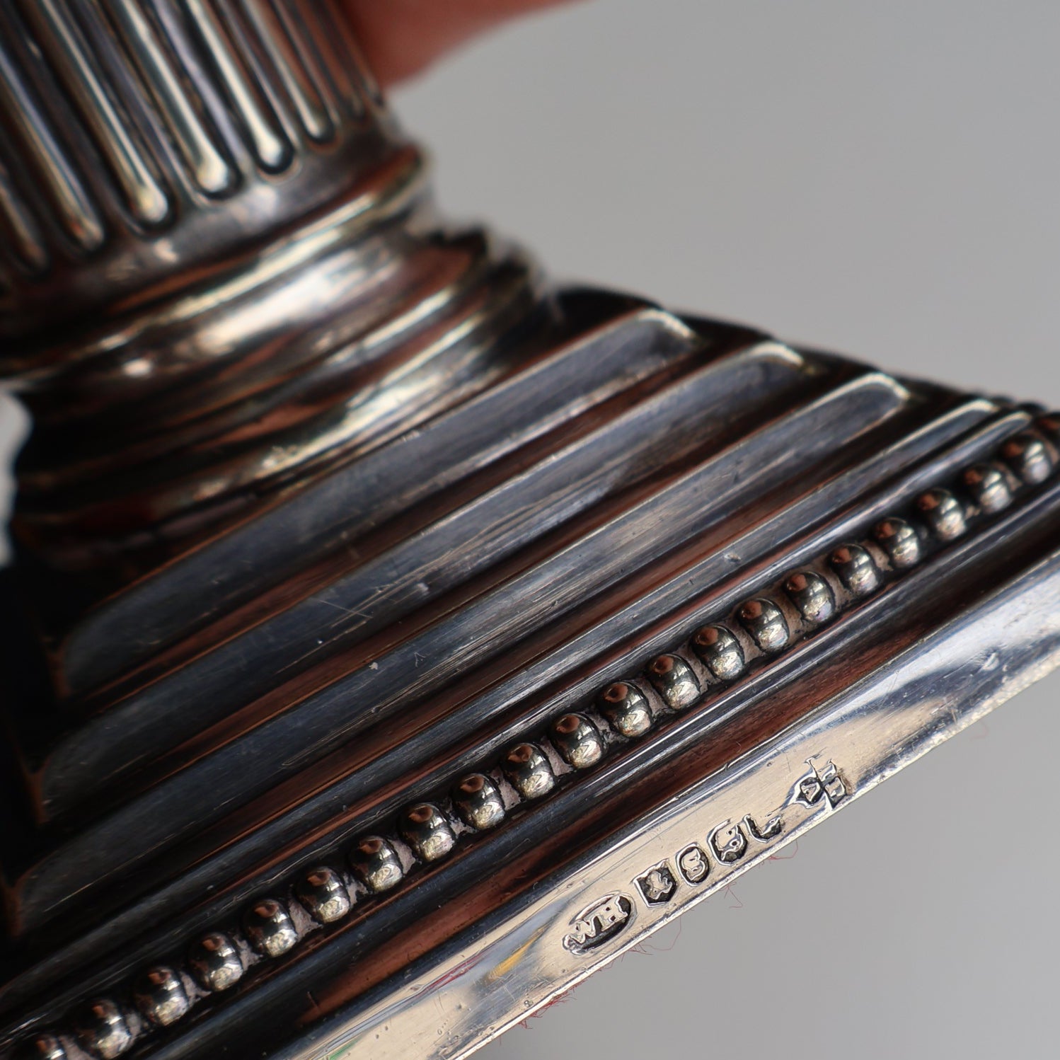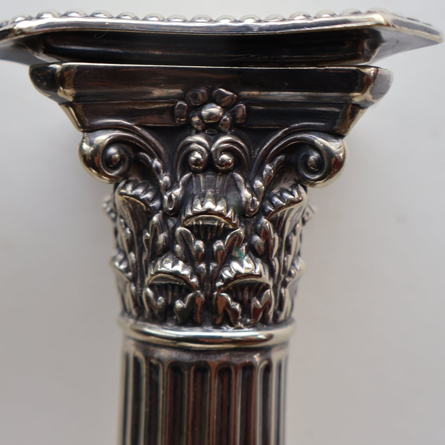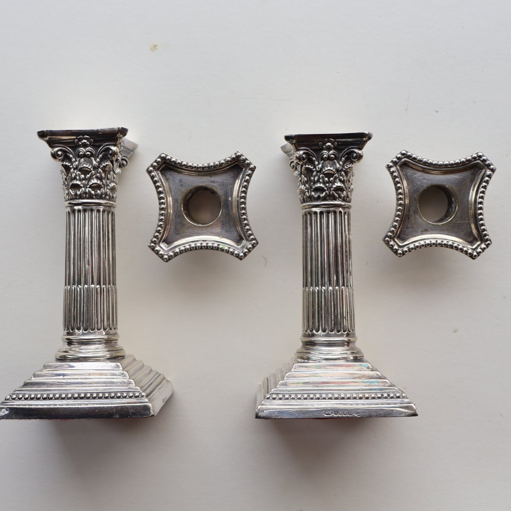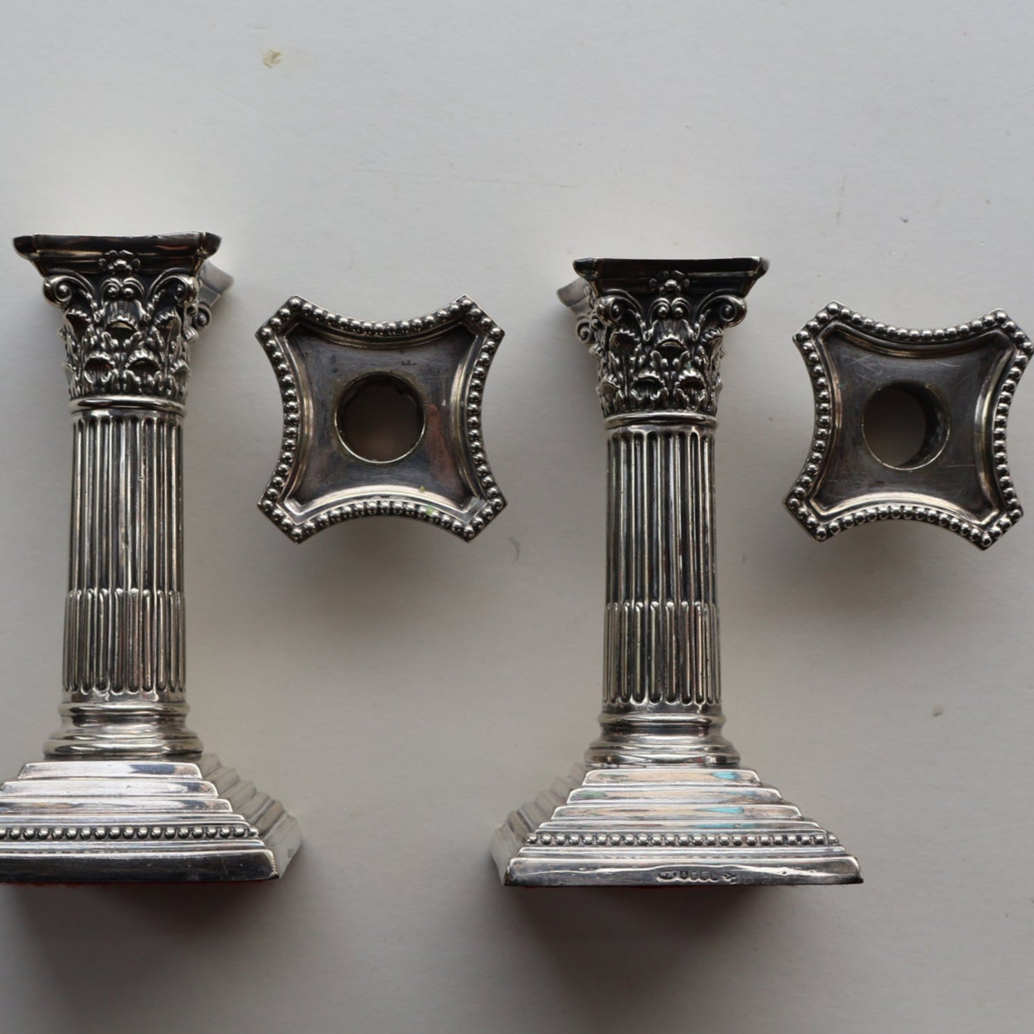 The are a dwarf or miniature height and take the form Corinthian pillars. Each candlestick has a square plinth base - and with a fluted column and topped with Corinthian capitals. The fluted columns have decorative dots a third of the way up, as photographed. Each have drip trays edged with little balls - these can be removed to allow for cleaning if required.