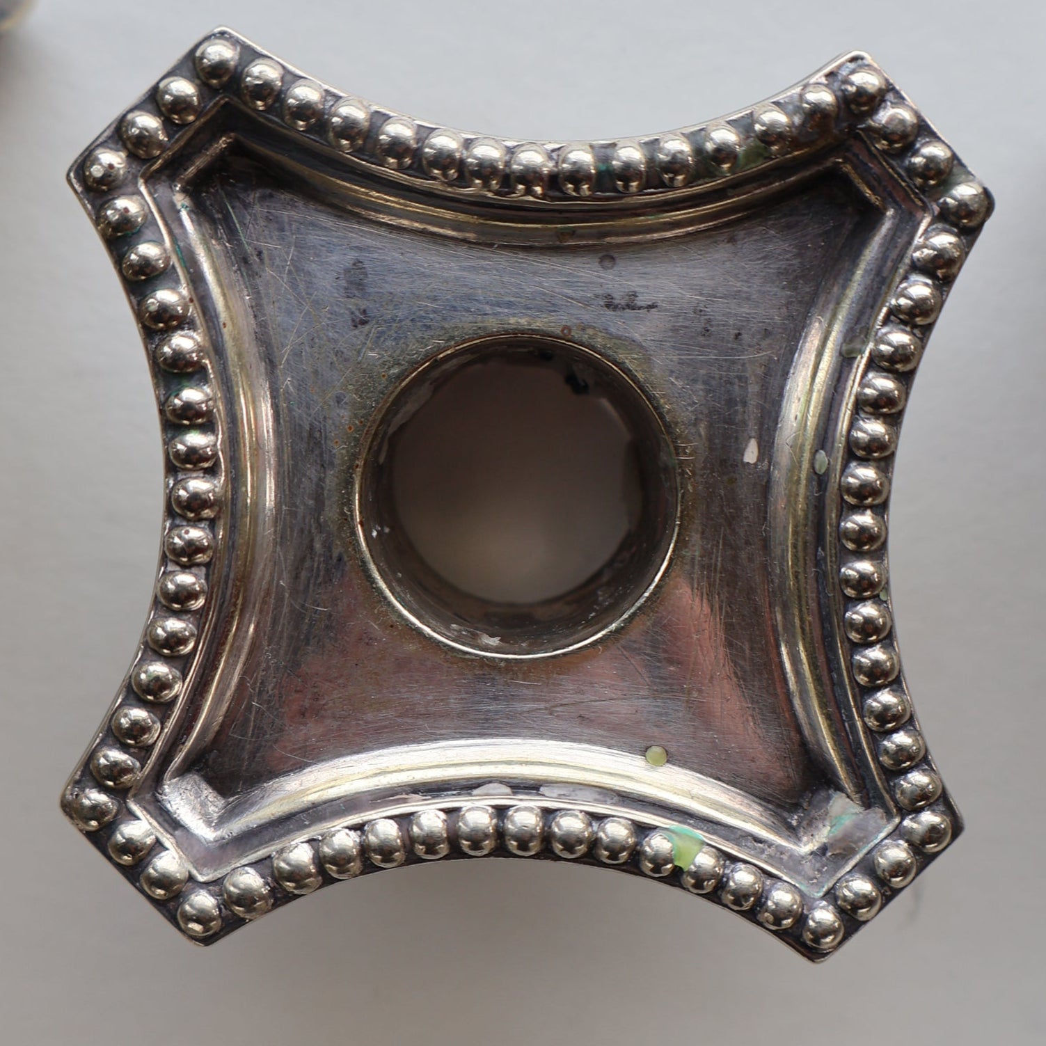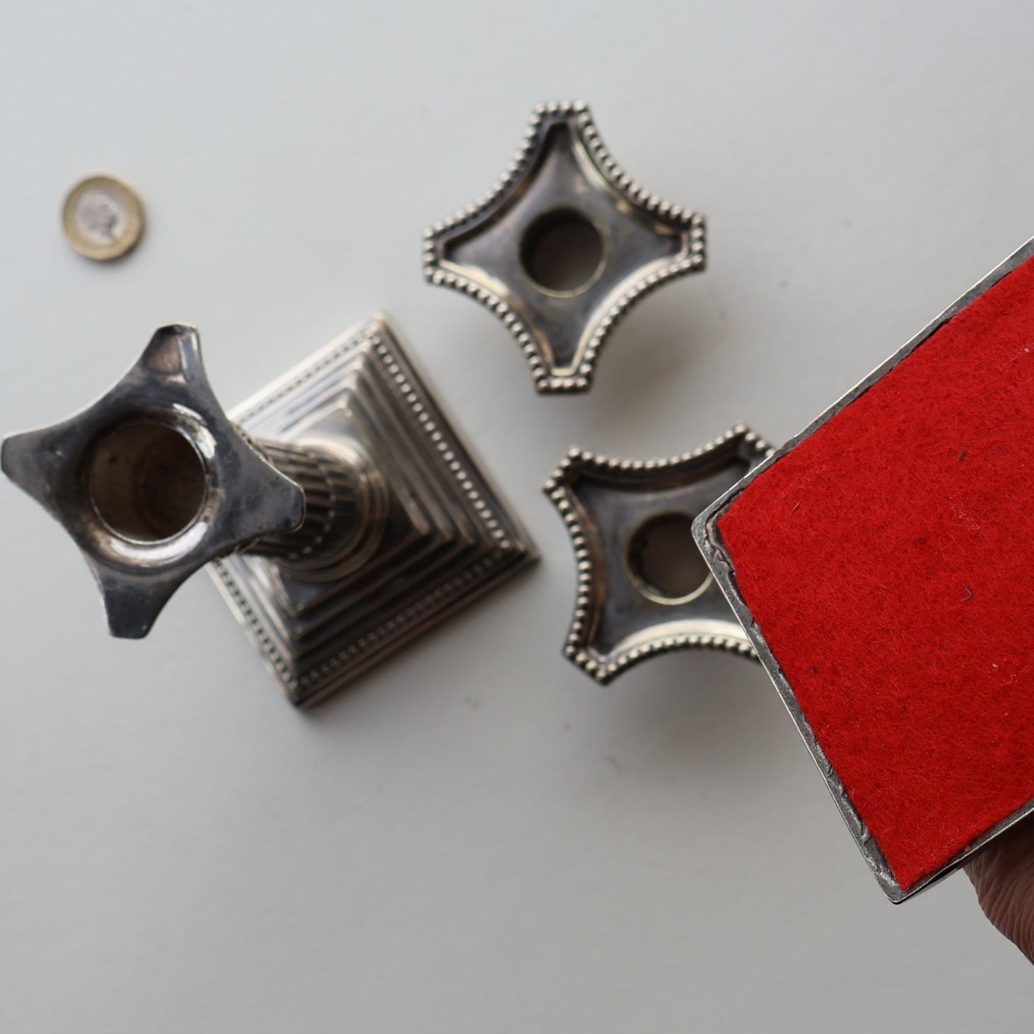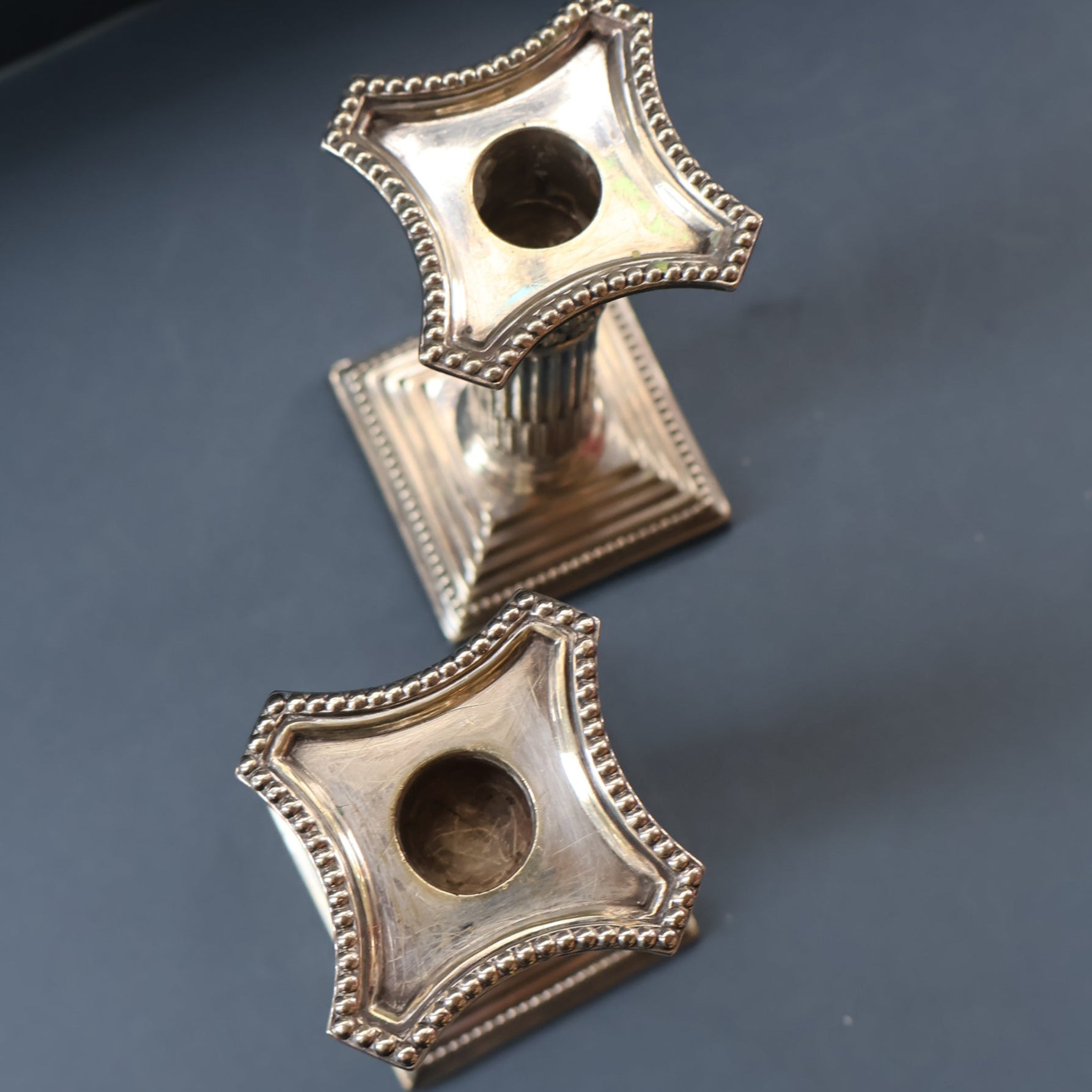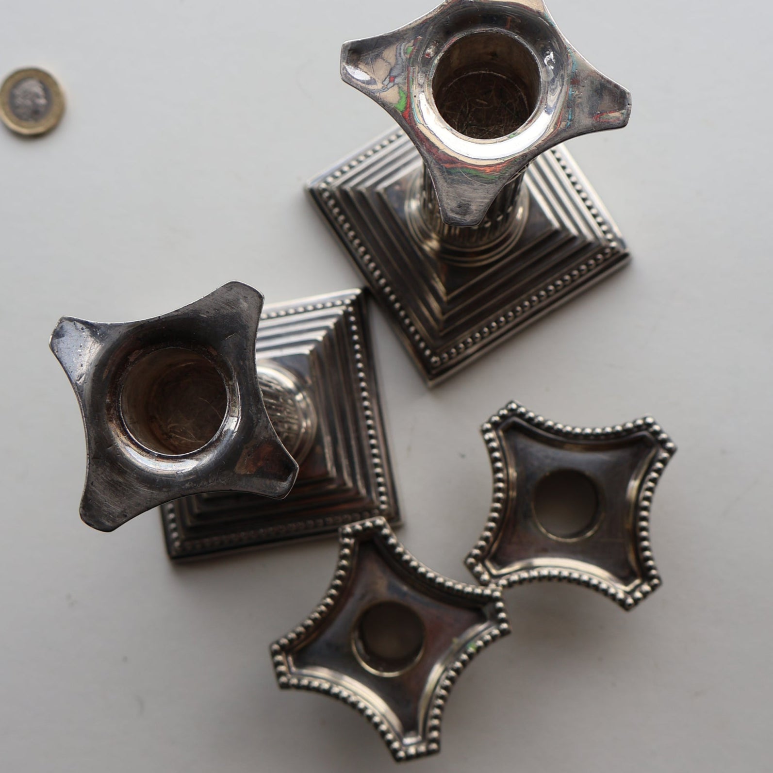The are a dwarf or miniature height and take the form Corinthian pillars. Each candlestick has a square plinth base - and with a fluted column and topped with Corinthian capitals. The fluted columns have decorative dots a third of the way up, as photographed. Each have drip trays edged with little balls - these can be removed to allow for cleaning if required.