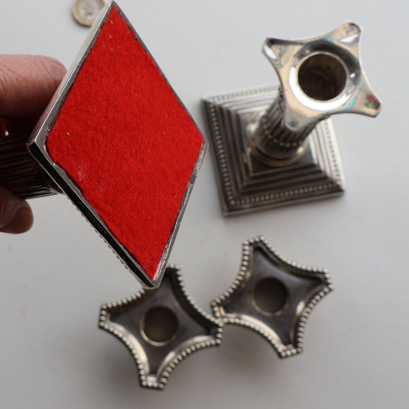There is a new red felt base on the bottom of each candlestick, as photographed.