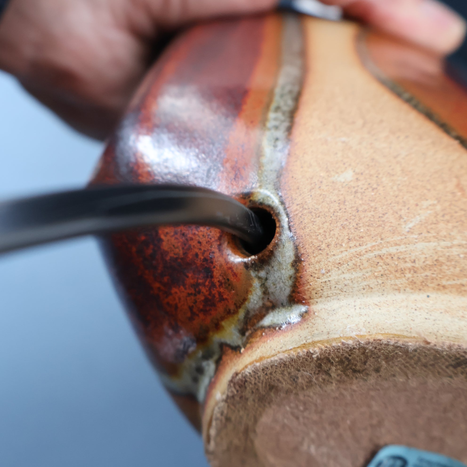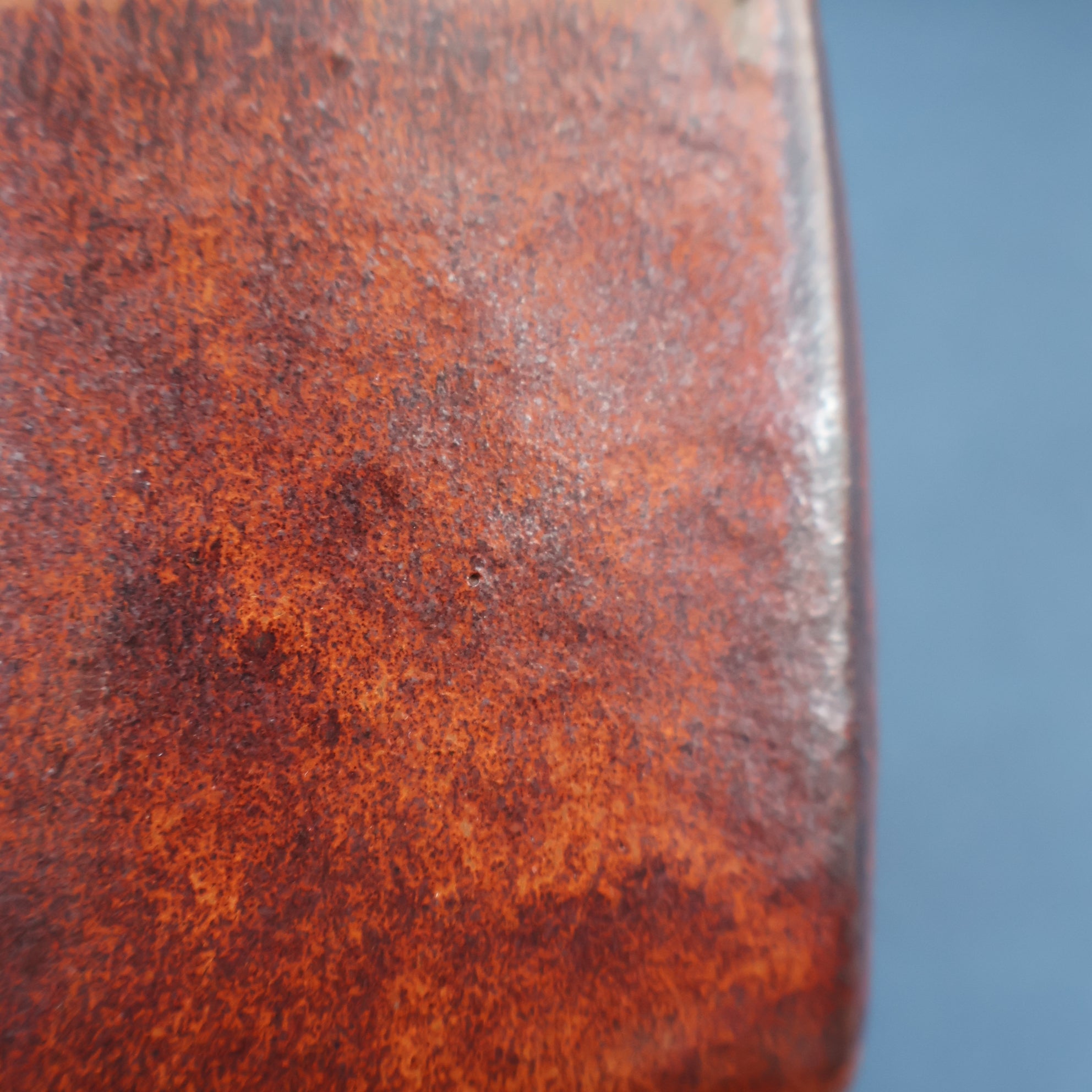 This a lovely pebble-shaped lamp decorated eggshell chocolate and rust coloured glazes that form abstract shapes. These resemble the layers that you might find within a broken stone or pebble.