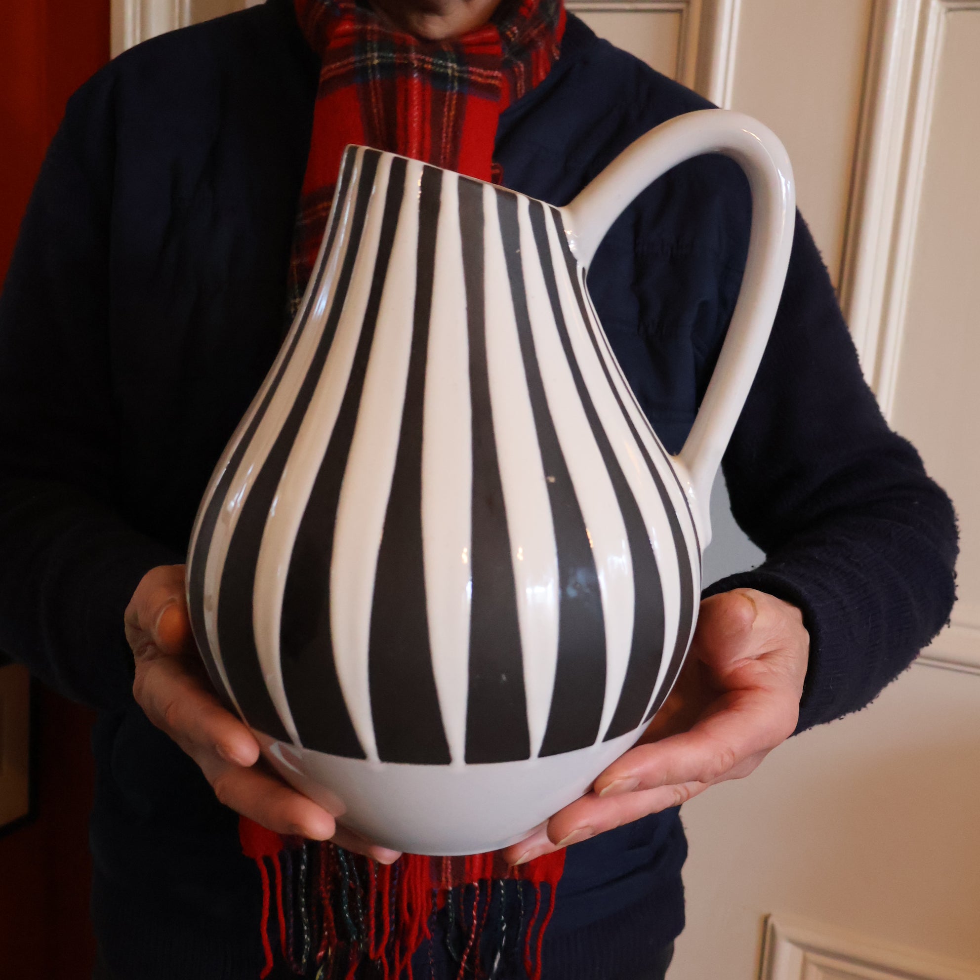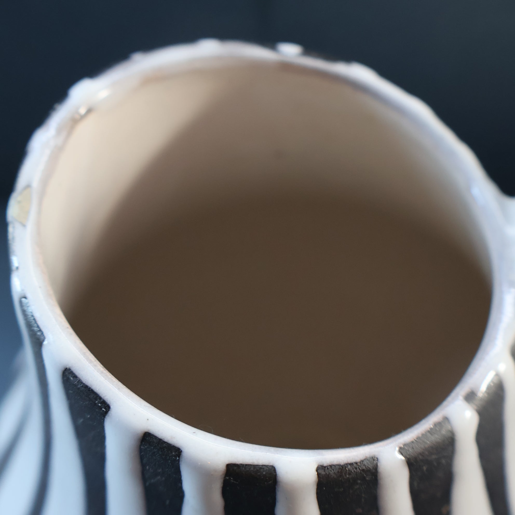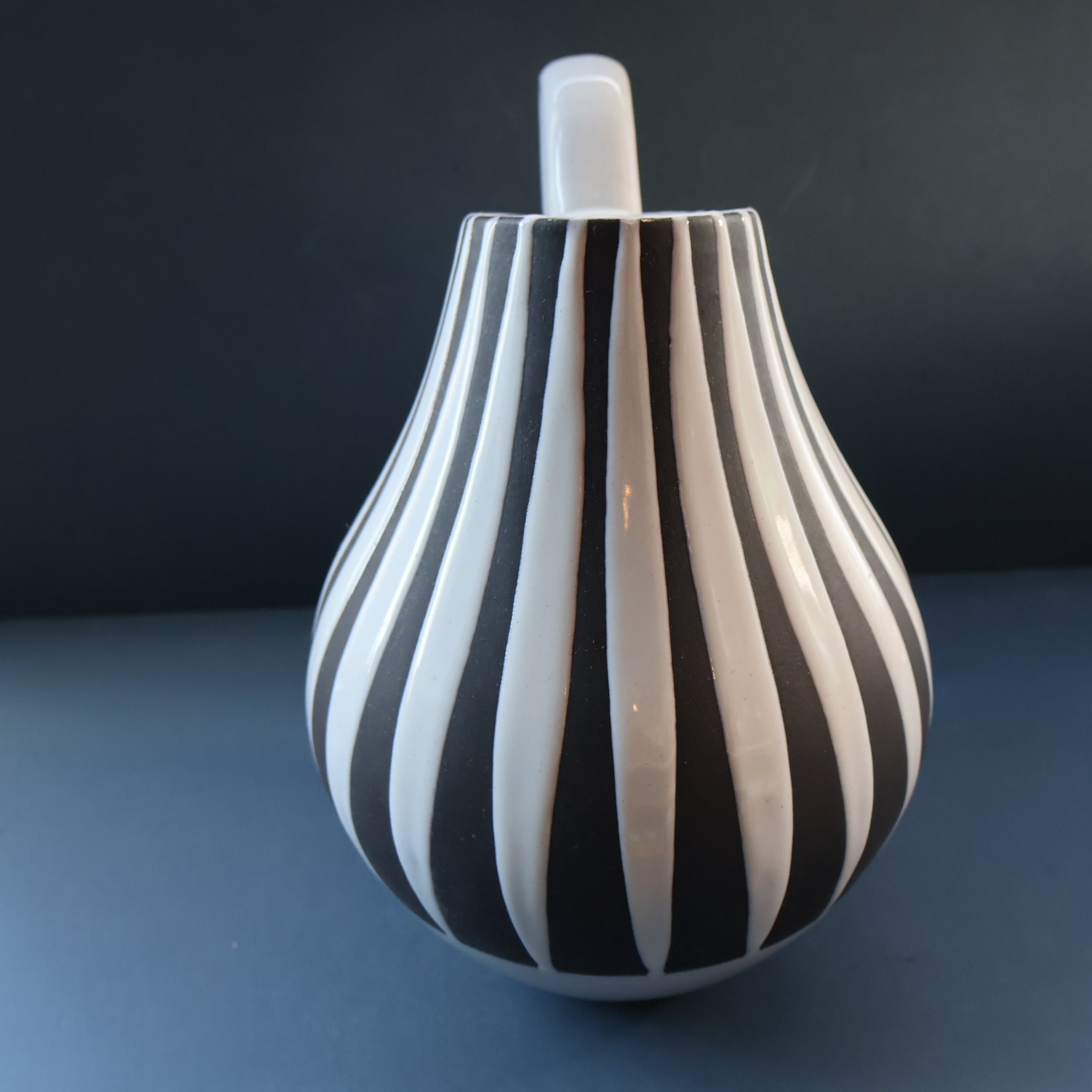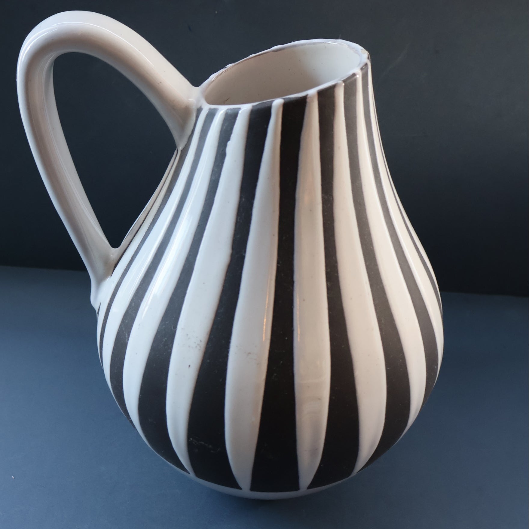 My large pitcher or vase has vertical matt black stripes. The rest of the vase is a glossy white glaze.