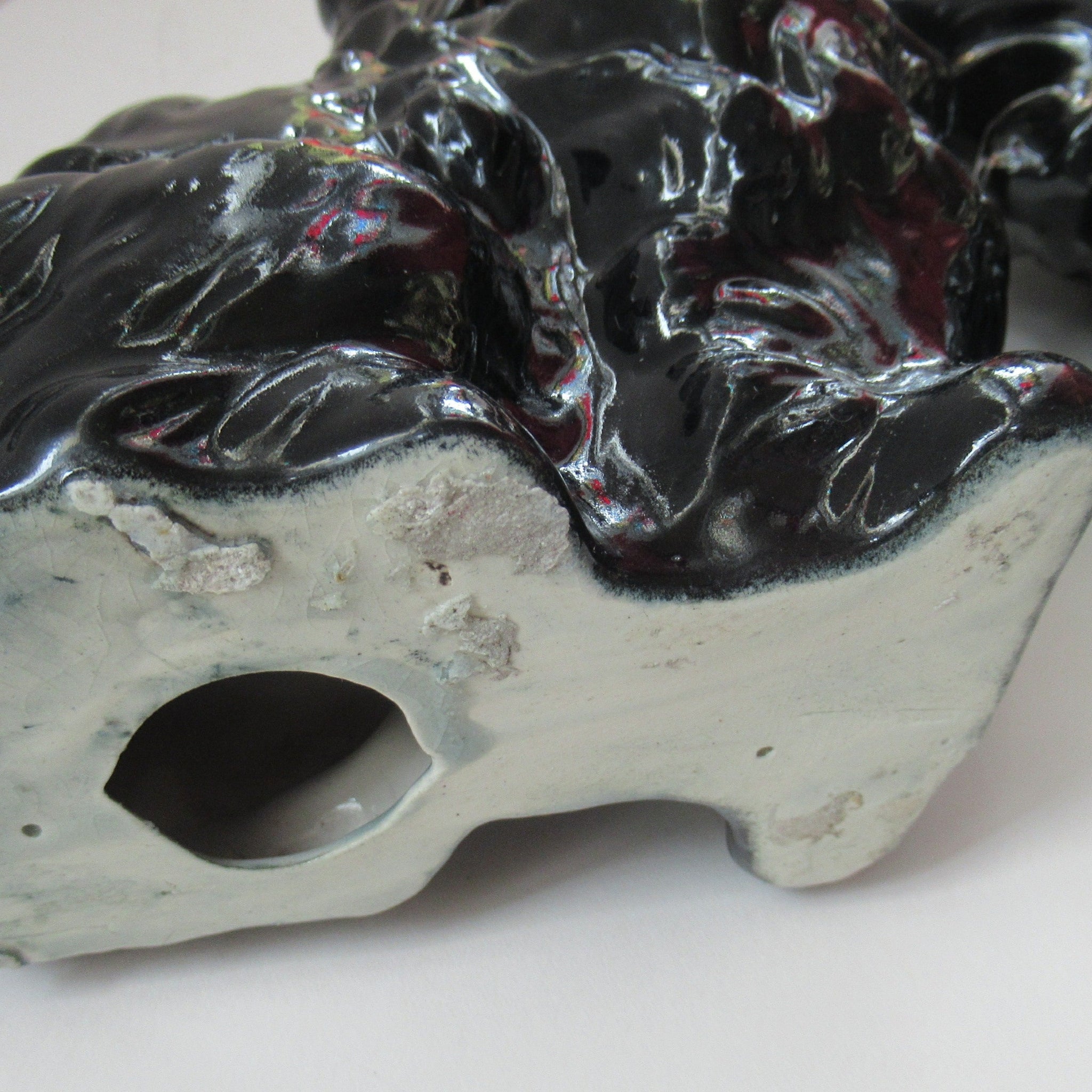 These wee Bo'ness models are very similar to Jackfield ones. They have the same black enamel glaze and gold highlights - but instead of red clay, they are made from white-coloured clay. They have a large air-hole in each base - as you often find on Bo'ness figures.