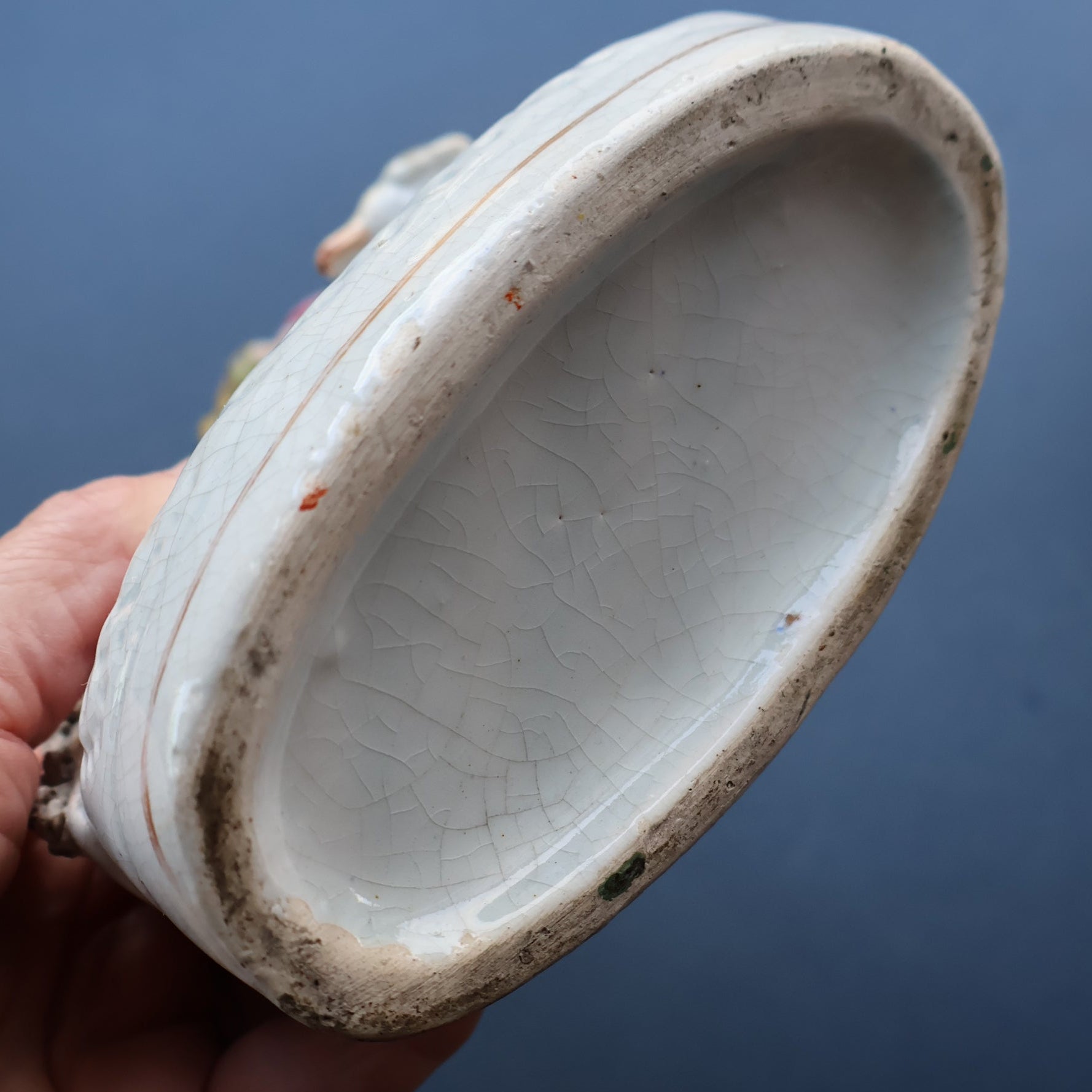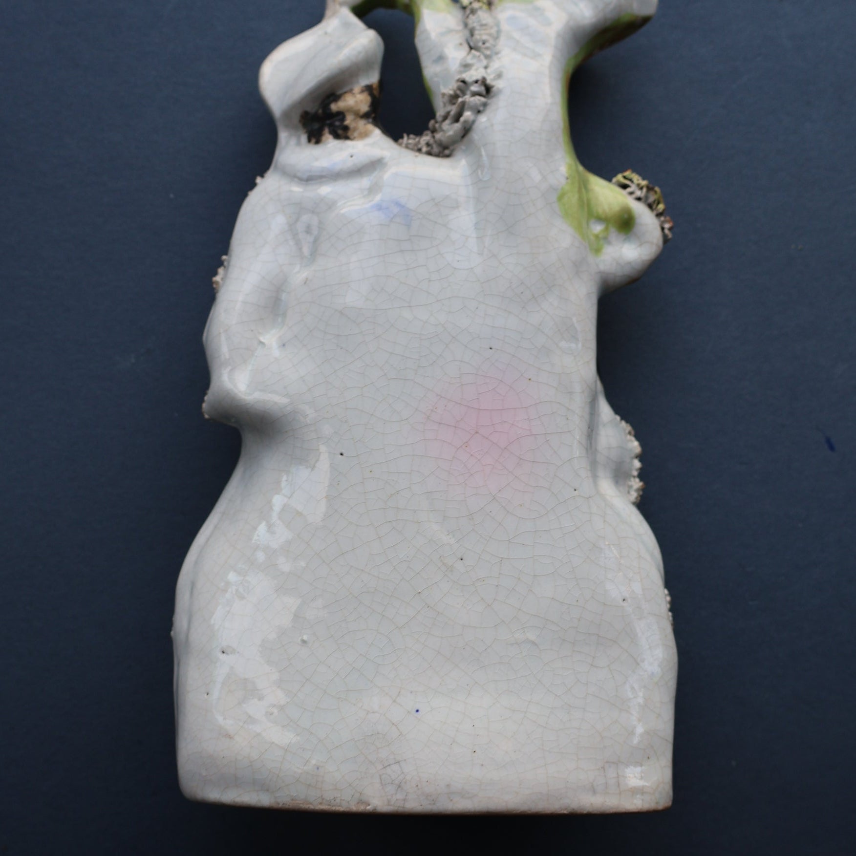 It comprised of a gentleman standing beside the tree. He is wearing a cap with a trailing pink feather. He has an inky blue jacket with a striped sash. Often these type of figures wear a kilt - but this one is different in that the man is wearing short baggy breeches - decorated with vertical stripes. He wears black leather boots. The lady is probably a shepherdess, is a broken crook lies on the ground in front of here. She is much smaller than the man and is seated, She has a blue bodice and billowing pink skirt decorated with little flecks. She is holding a basket of fruits. To the right hand side is a spotted dog - he jumps up and clings onto his master. Strange symbolism in this one! The tree has applied bocage decoration and more bocage runs around the side of the lady and around the top section of the standing man.