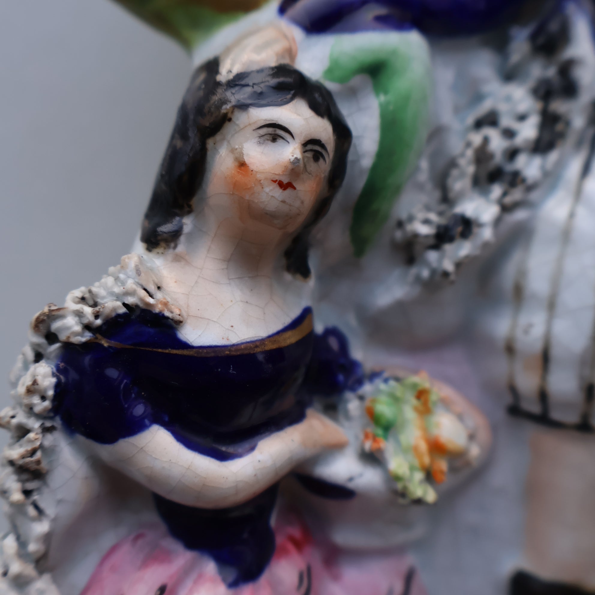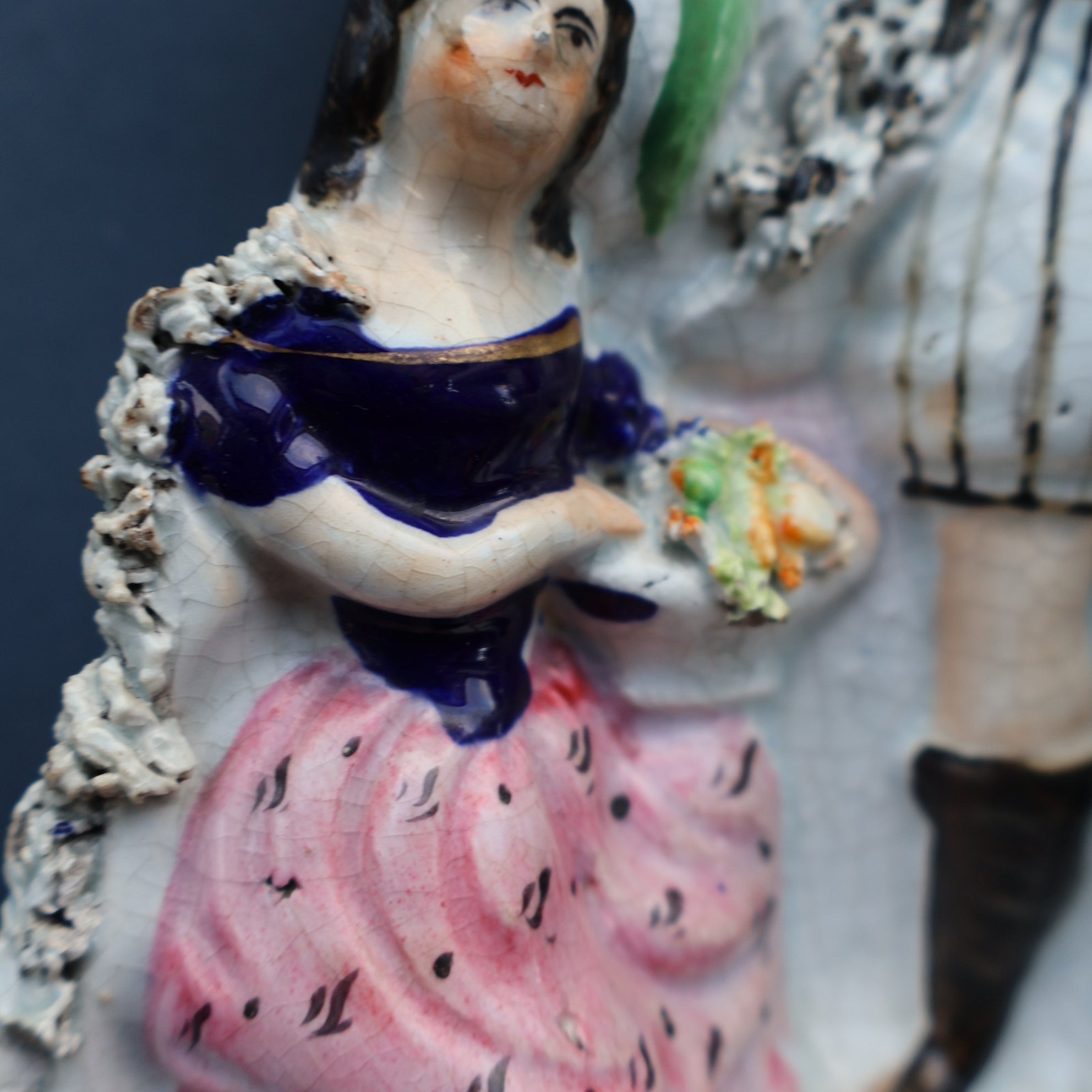 Rarer ANTIQUE Staffordshire Figurine / Spill Vase Featuring a Man and Woman with Dog Standing Beside a Tree