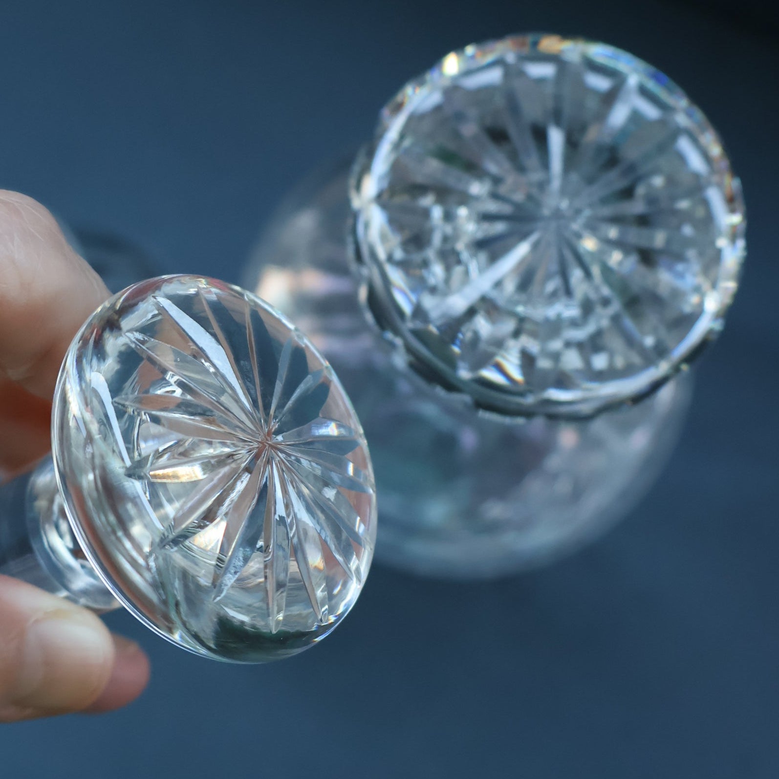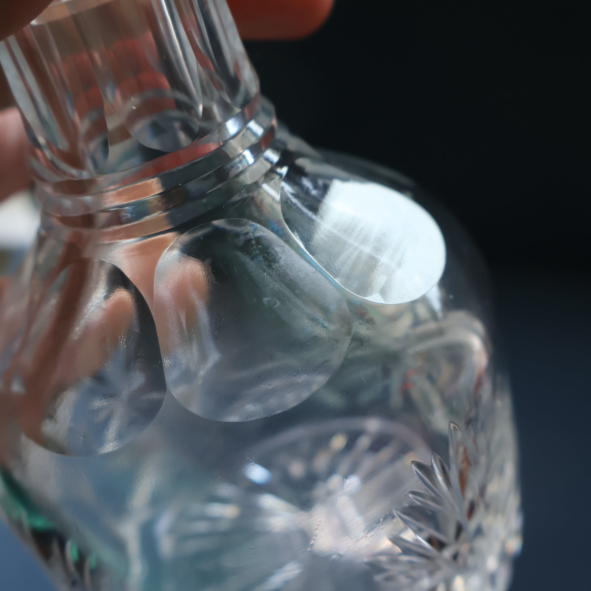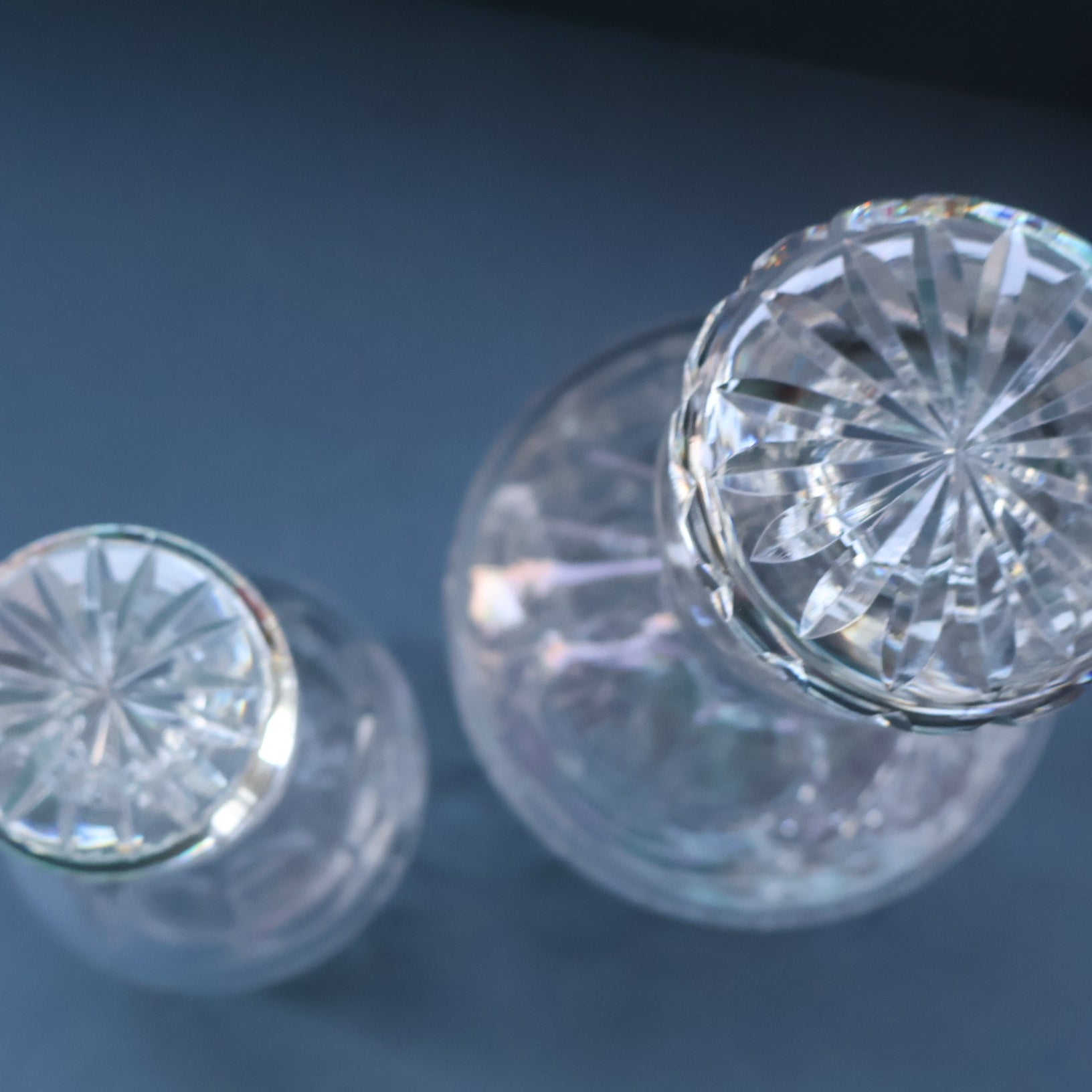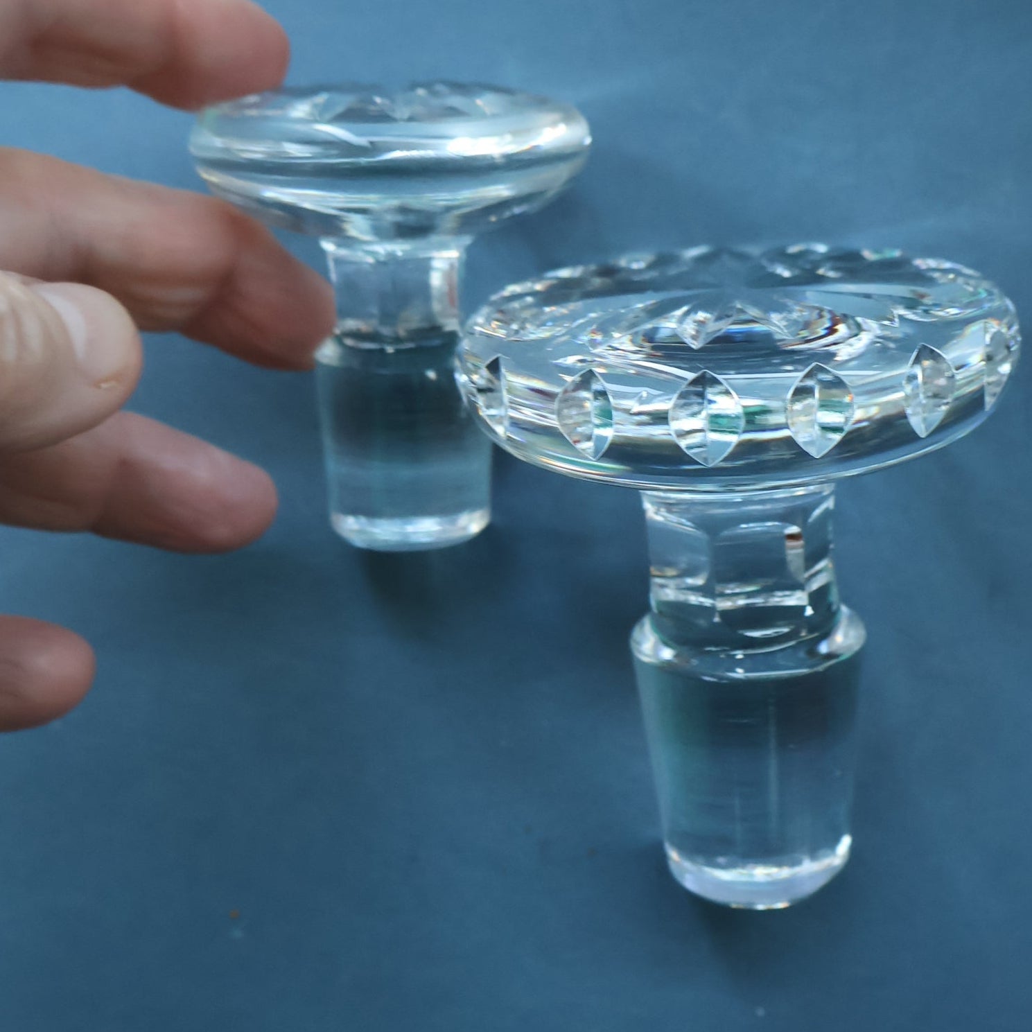 The neck of each decanter has polished facets which rise up the neck towards the flared rim. Around the base of the decanters is the traditional Star of Edinburgh pattern. The base have a deeply engraved star shape. The stoppers are original to the decanter and are more unusual flattened floral ones.