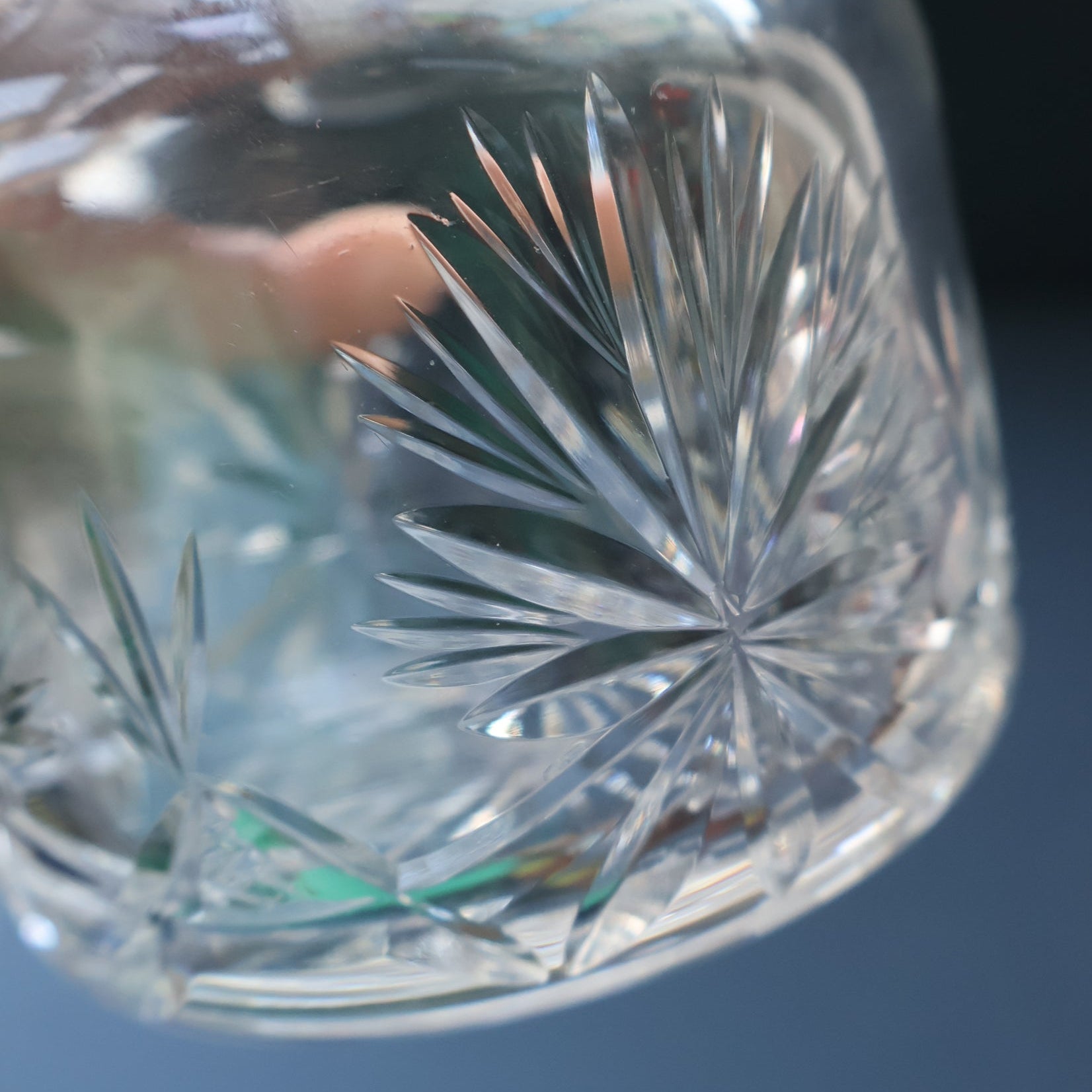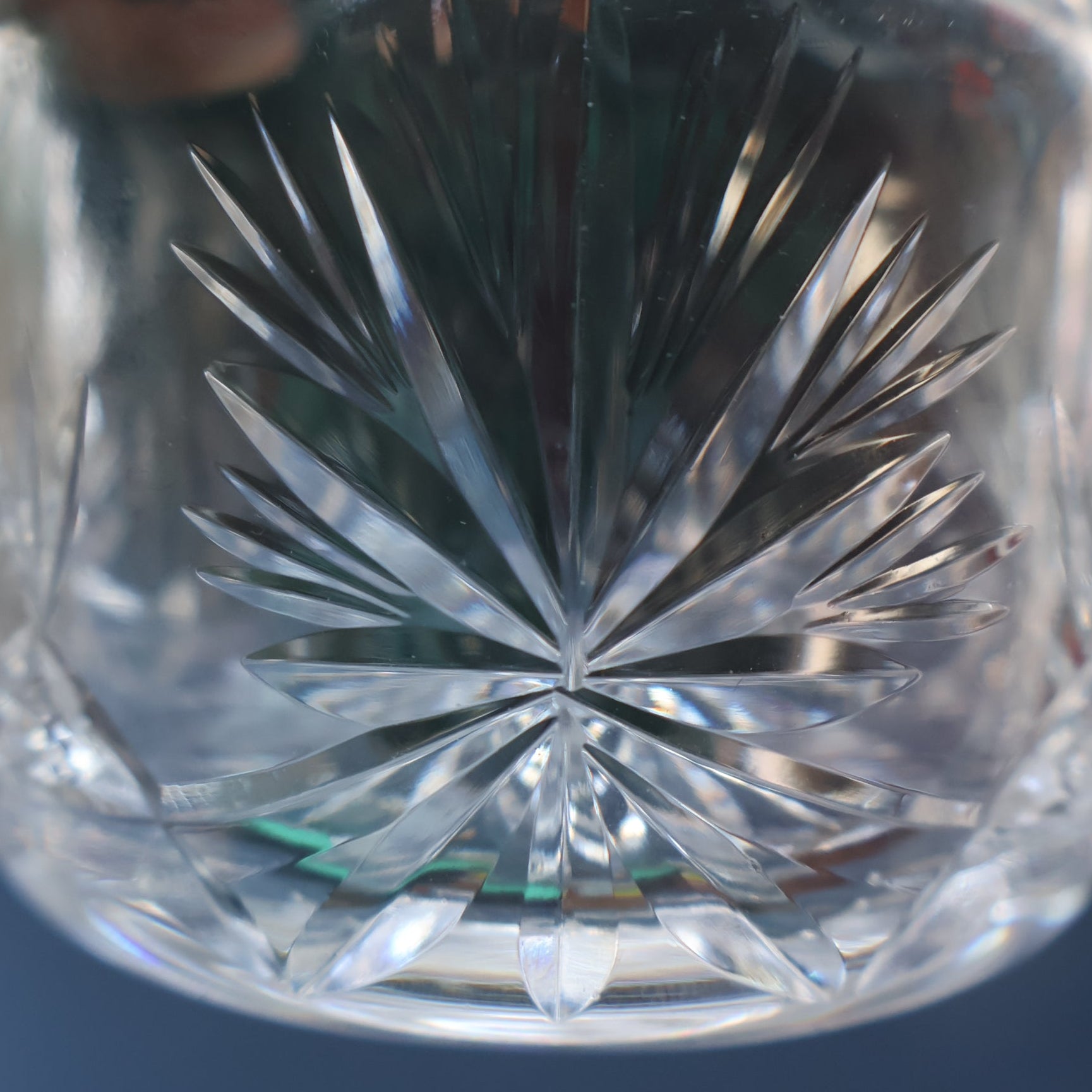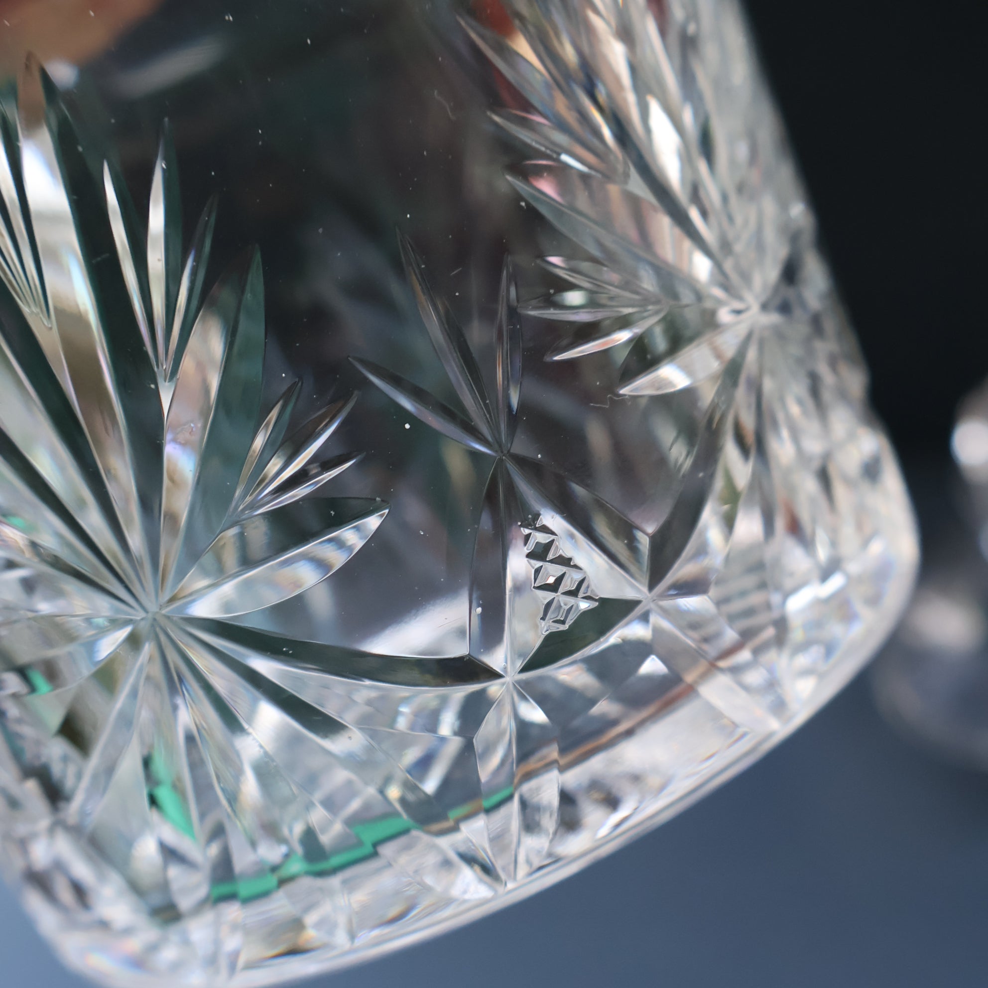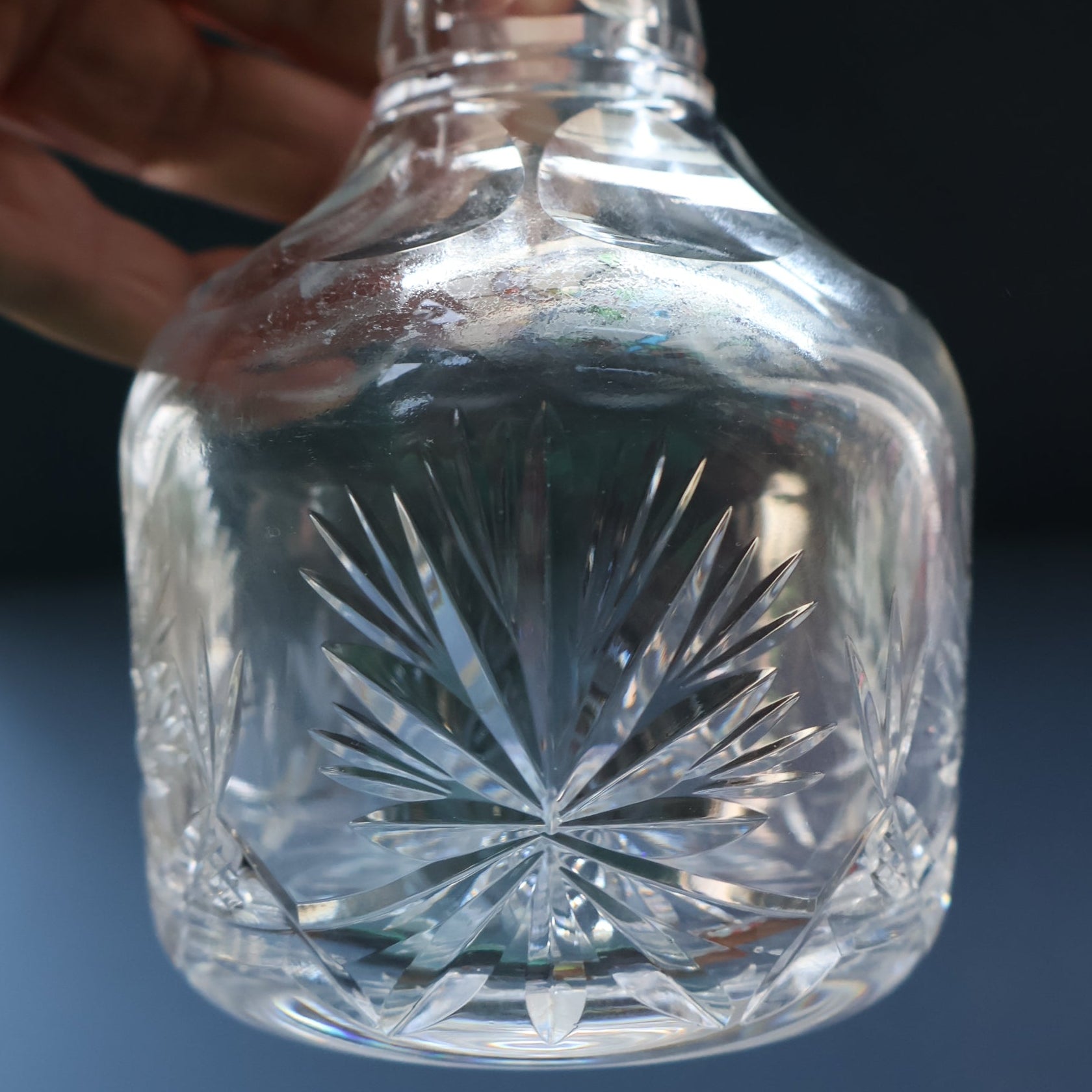 The neck of each decanter has polished facets which rise up the neck towards the flared rim. Around the base of the decanters is the traditional Star of Edinburgh pattern. The base have a deeply engraved star shape. The stoppers are original to the decanter and are more unusual flattened floral ones.