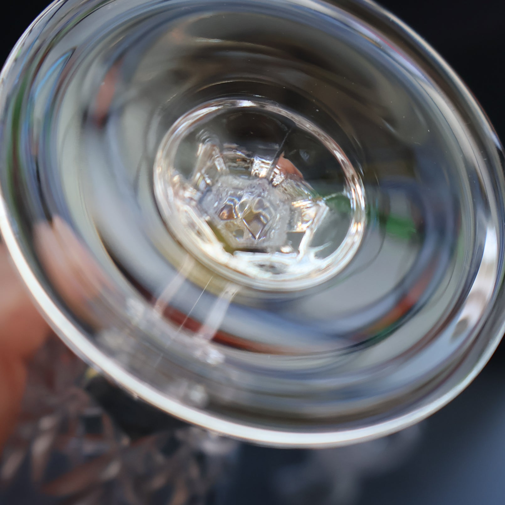 The bowl is a pretty shape with a fan and criss cross pattern on the bowl. I love the little faceted bobble at the top of the stem and the fluted stem. The foot is clear without decoration.