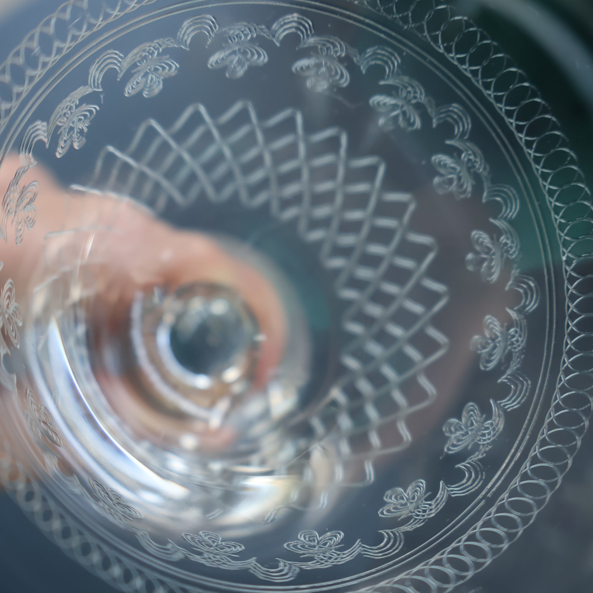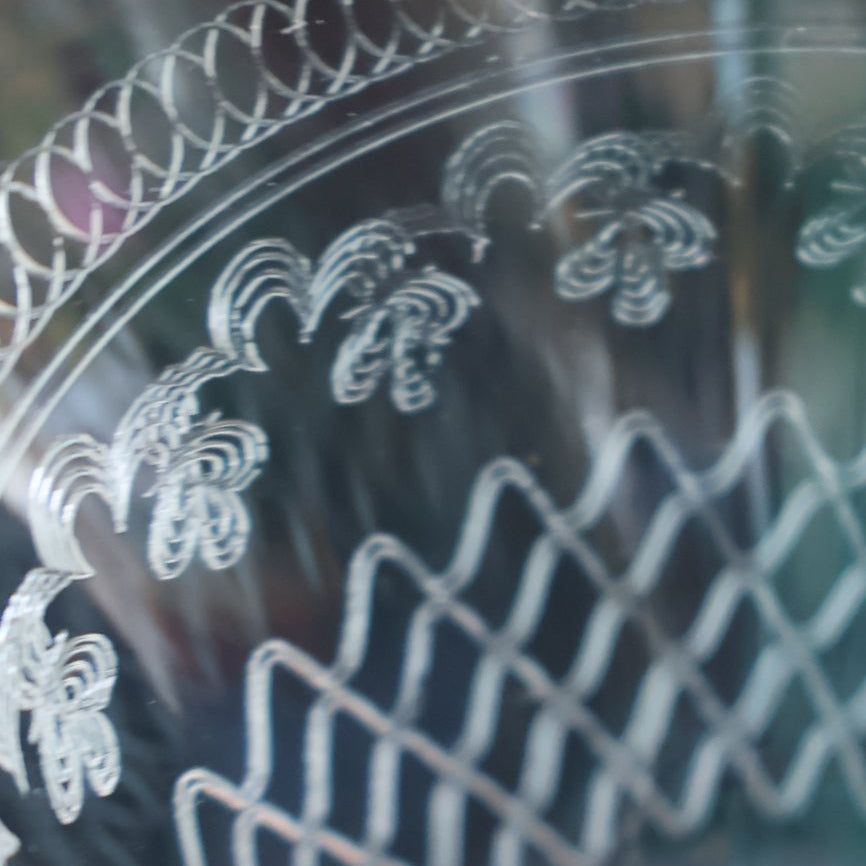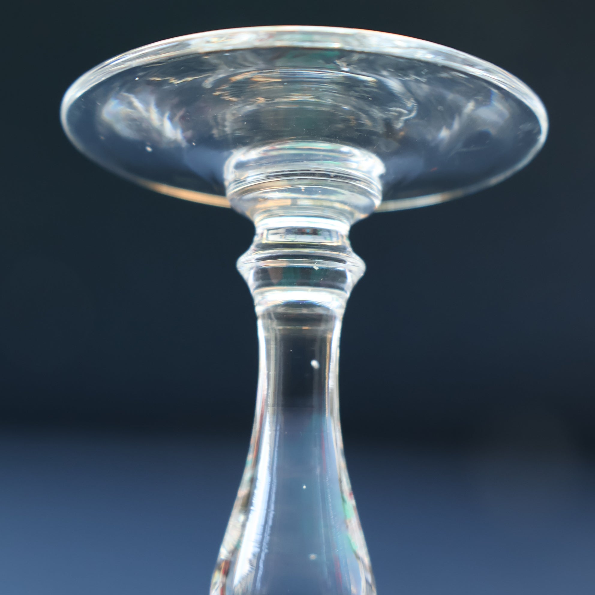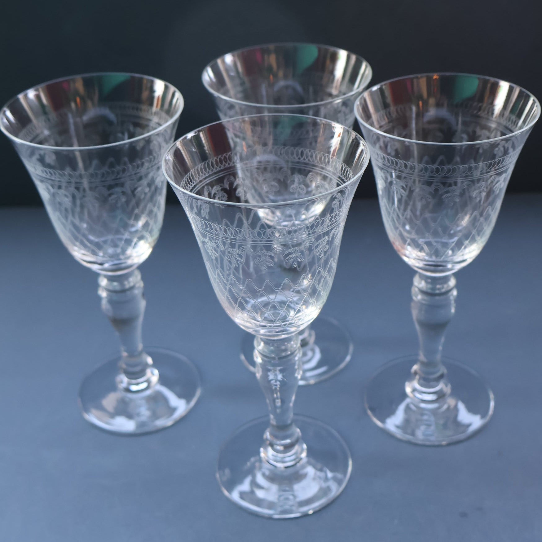 This is set of six lead glass, balustroid claret glasses dating from the end of the 20th century, c1970. The glass was manufactured in Bohemia (now part of the Czech Republic). The design, however, was typically English in detail. The pattern was a popular one and used for many years - they were first sold at the beginning of the 20th century by Woolworths among other retailers. The intricate design on each glass was achieved by using a pantograph to etch the pattern into the glass.