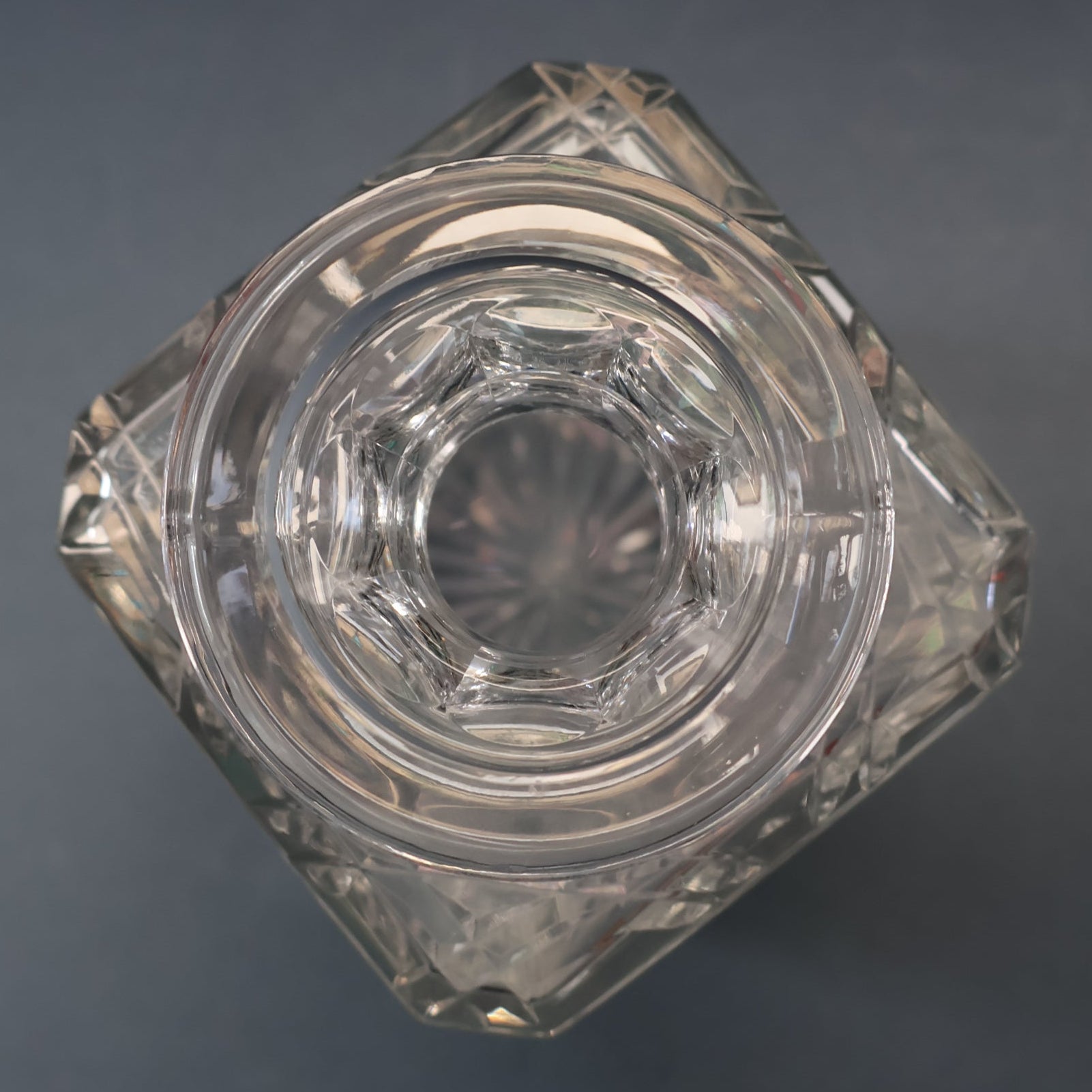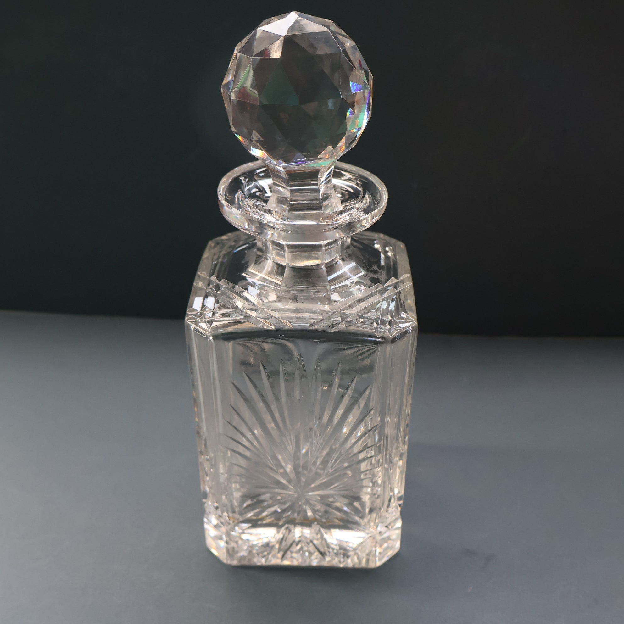 Dimensions: Height with stopper is 10 inches and it is just over 4 inches square. The stopper is rather dazzling with its all over facets which catch the light - it is in perfect condition, but of course!