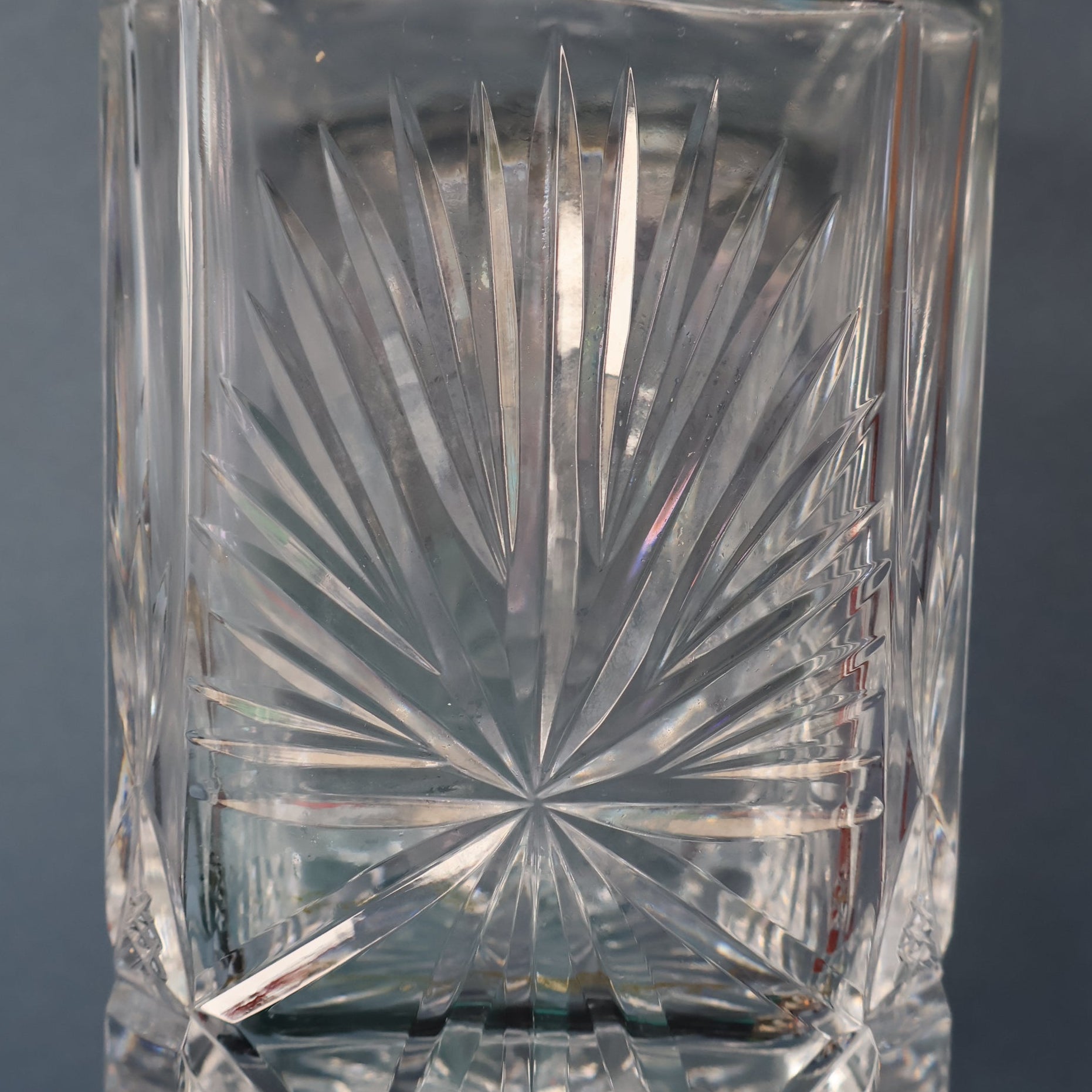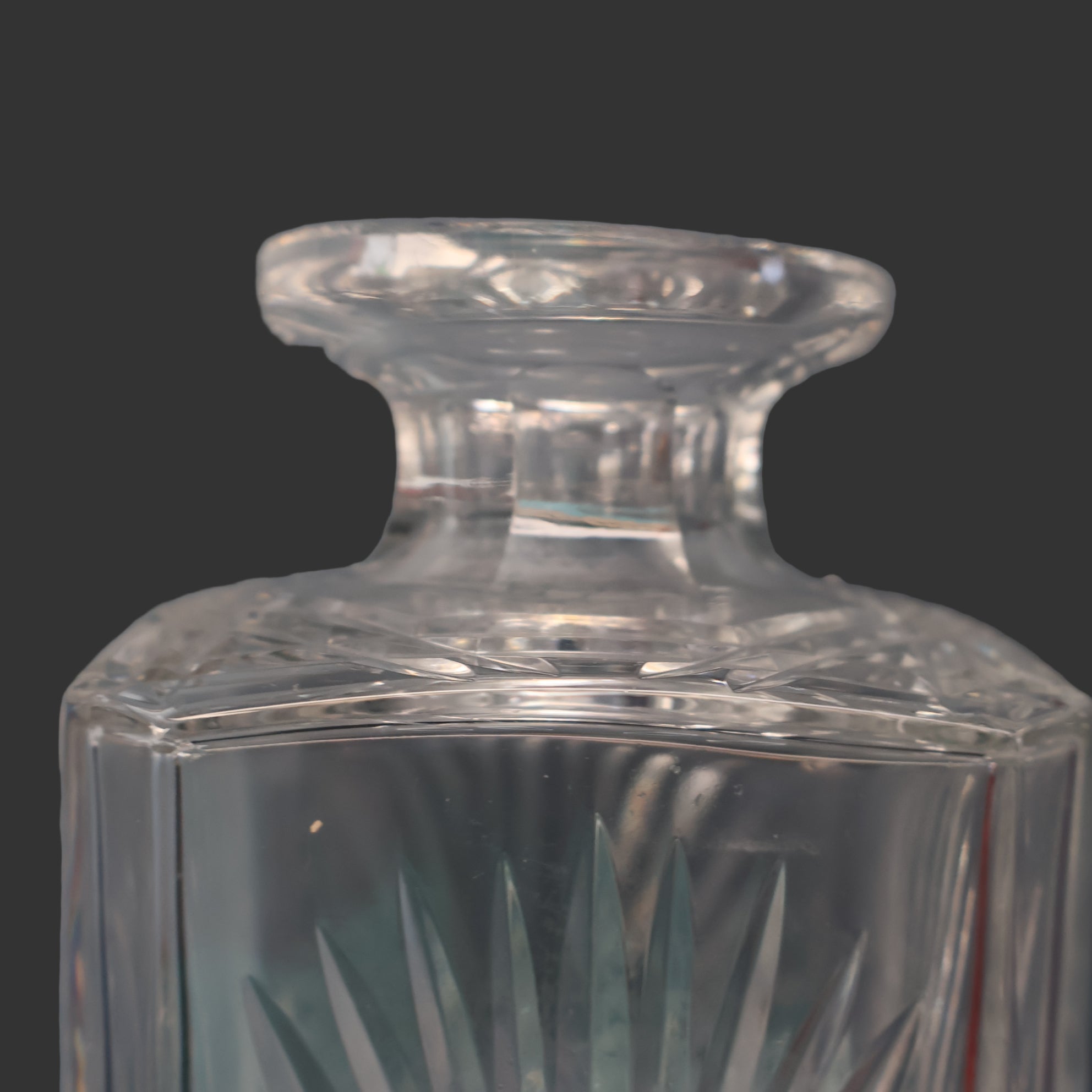The decanter is square cut with chamfered corners. The sides of the decanter are decorated all around with a large deeply engraved fan - it is a very dramatic design. There is a large deeply engraved large star on the base.