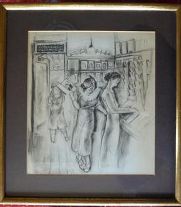 This is a very lovely drawing and I think a rare one showing this imagery. The ladies are shopping for cards or decorative prints - and you can buy five of these wee sheets for 5 cents.