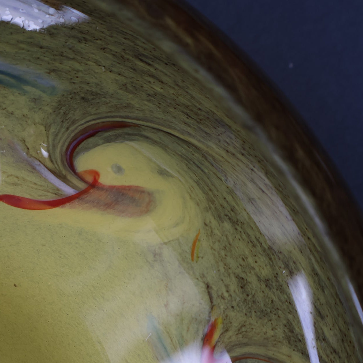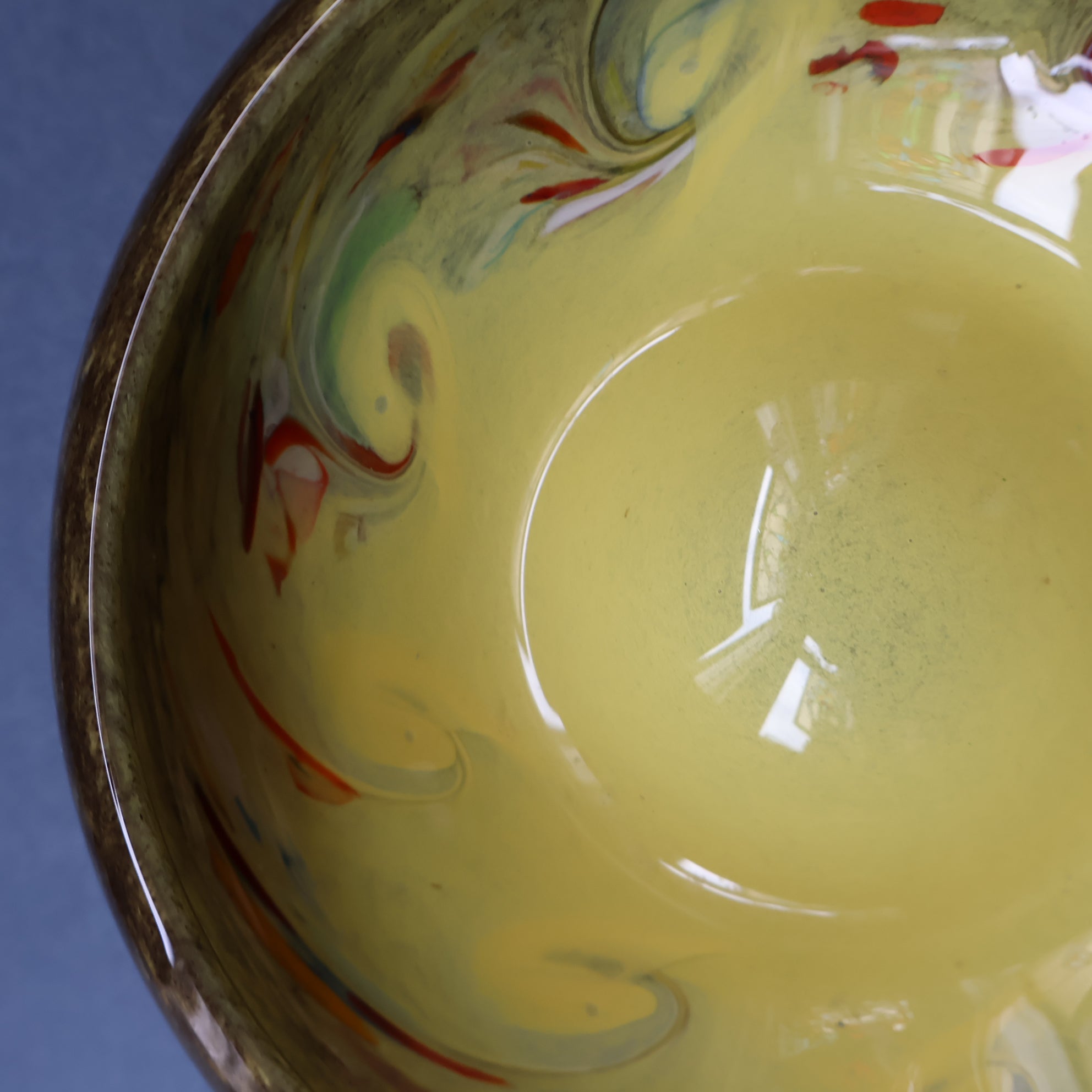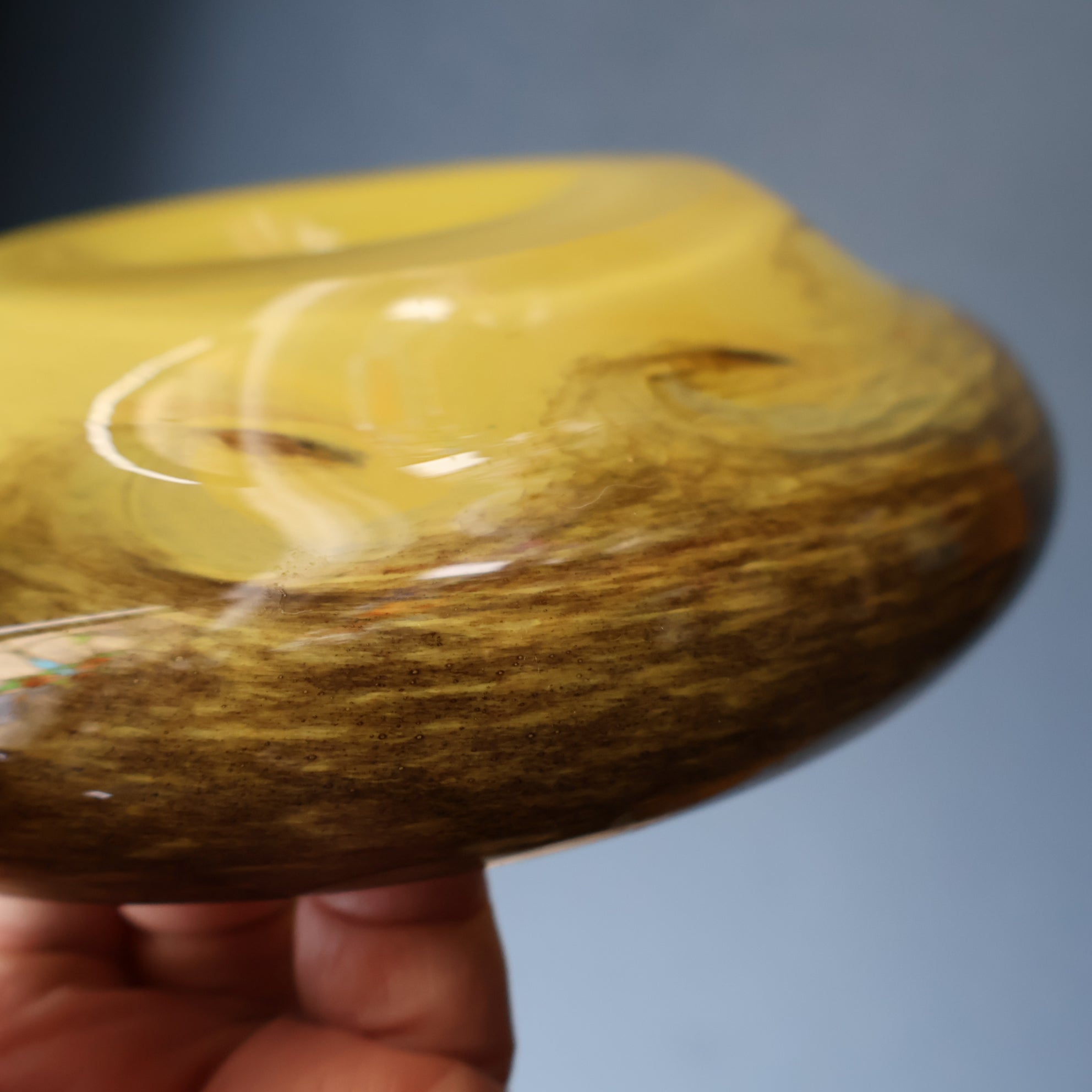 This is a lovely opaque yellow glass bowl with black flecks and random dots of bright colours in the vortex of each swirl. It was made by Strathearn Glass.