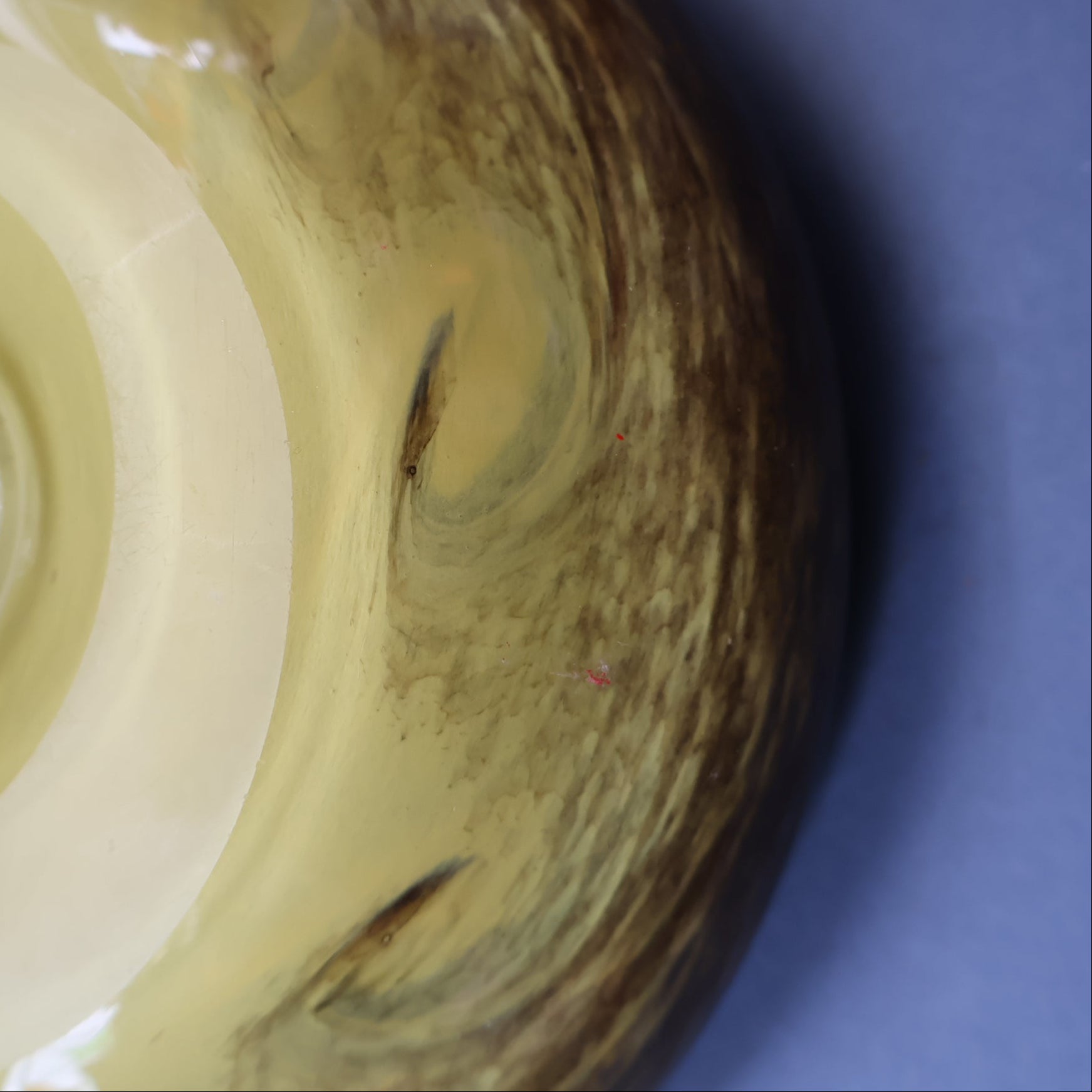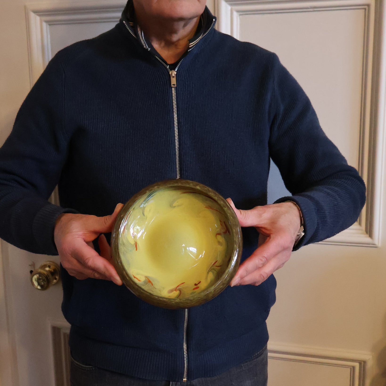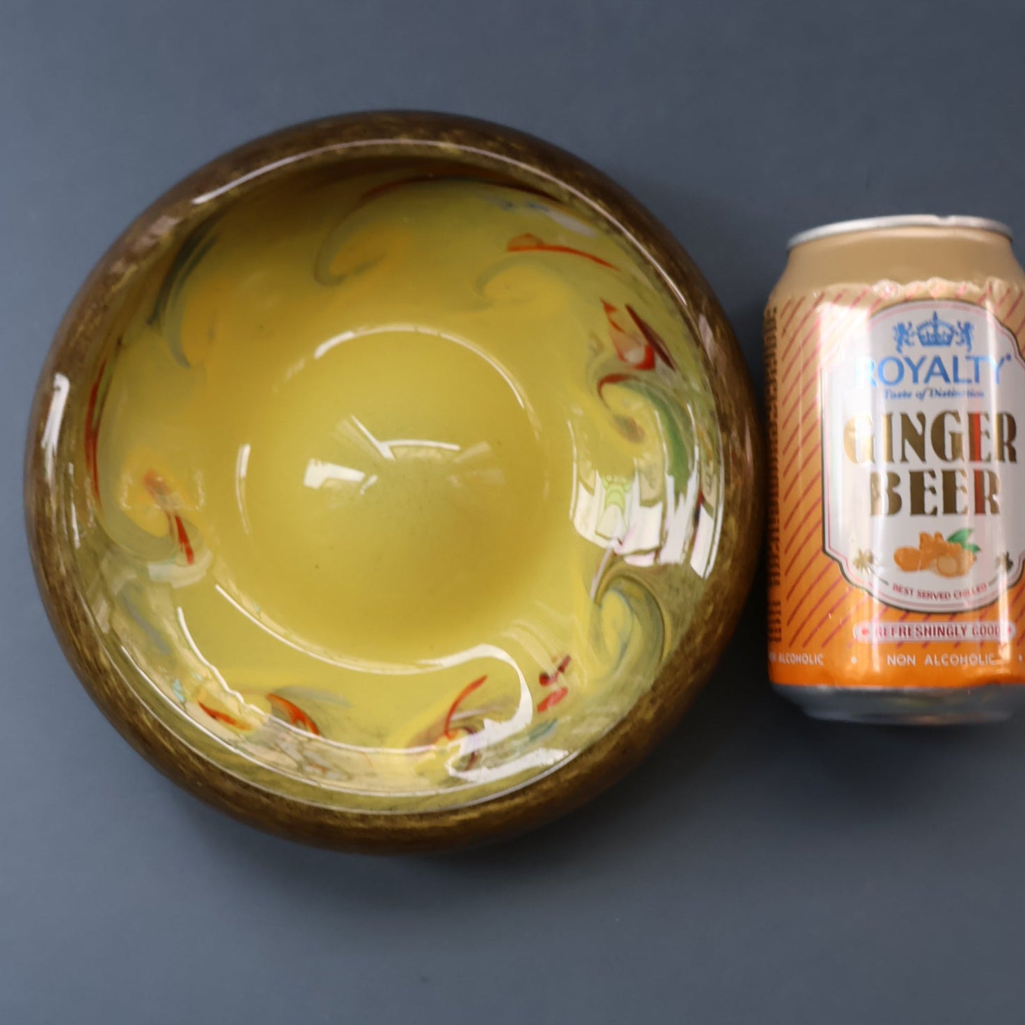 This is a lovely opaque yellow glass bowl with black flecks and random dots of bright colours in the vortex of each swirl. It was made by Strathearn Glass.
