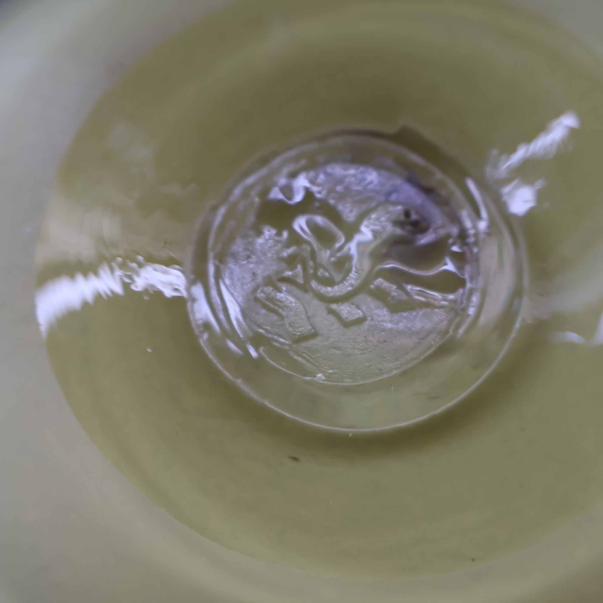My bowl is in excellent condition with no damages. Any white marks on my photos are not on the glass - but as caused by reflections, the glass is very shiny! The bowl has a pontil mark on the base and on this is an impressed Leaping Salmon mark.  It is 7 inches in diameter and 2 inches in height.  There is a raised dome section in the center of the bowl.