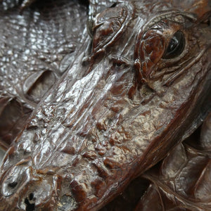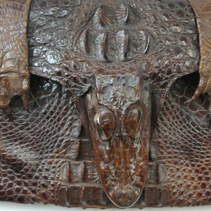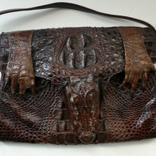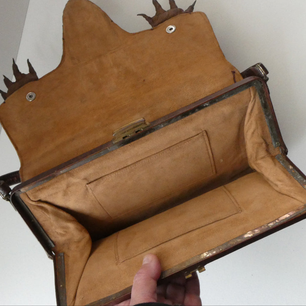 This is certainly a quirky handbag and is made from a little alligator. It is complete with its head (with little glass eyes), and little feet and all its wee claws. The little alligator head - even still has its upper little teeth, all as photographed.