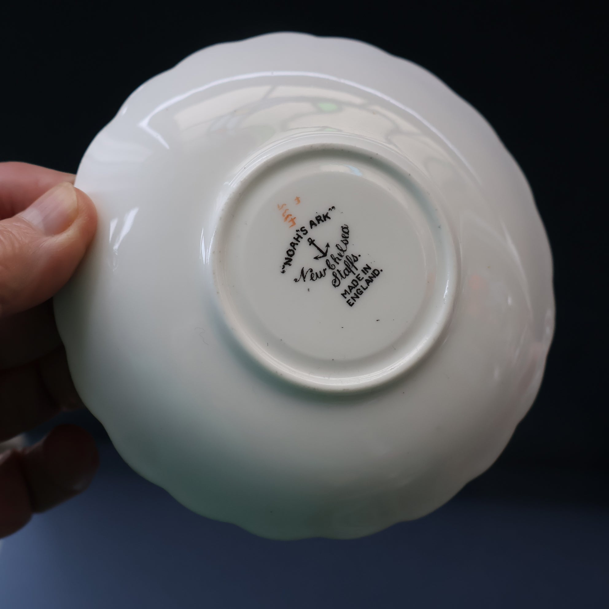 The pattern is called "Noah's Ark" and it was made by New Chelsea Pottery, Staffordshire. This pattern is now hard to source and this is reflected in my asking price. The cup and saucer are priced up at £15 and the side plate is also £15.
