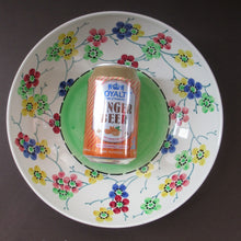 The interior of the bowl is hand-painted. There is a big peppermint green circular shape in the center - which has been painted with a large swirling brushstroke. There are long black lines - forming a pattern around - with on the white rim - there is a field of tiny little delicate flowers - painted in yellow, pink, peppermint, and royal blue shades.
