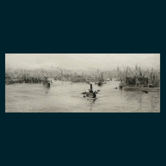 This fine, carefully observed etching shows a view of Leith Harbour - with the Old Town of Edinburgh seen on the high ground in the distance.