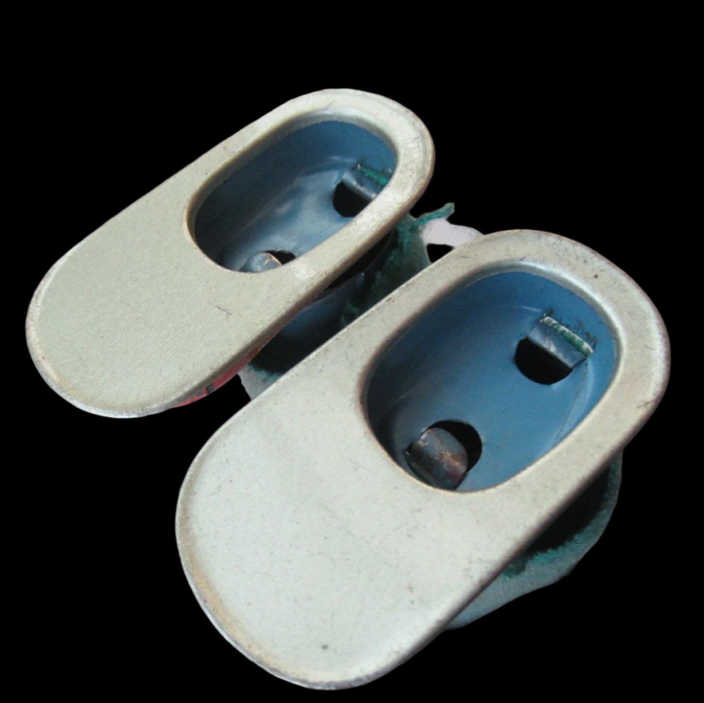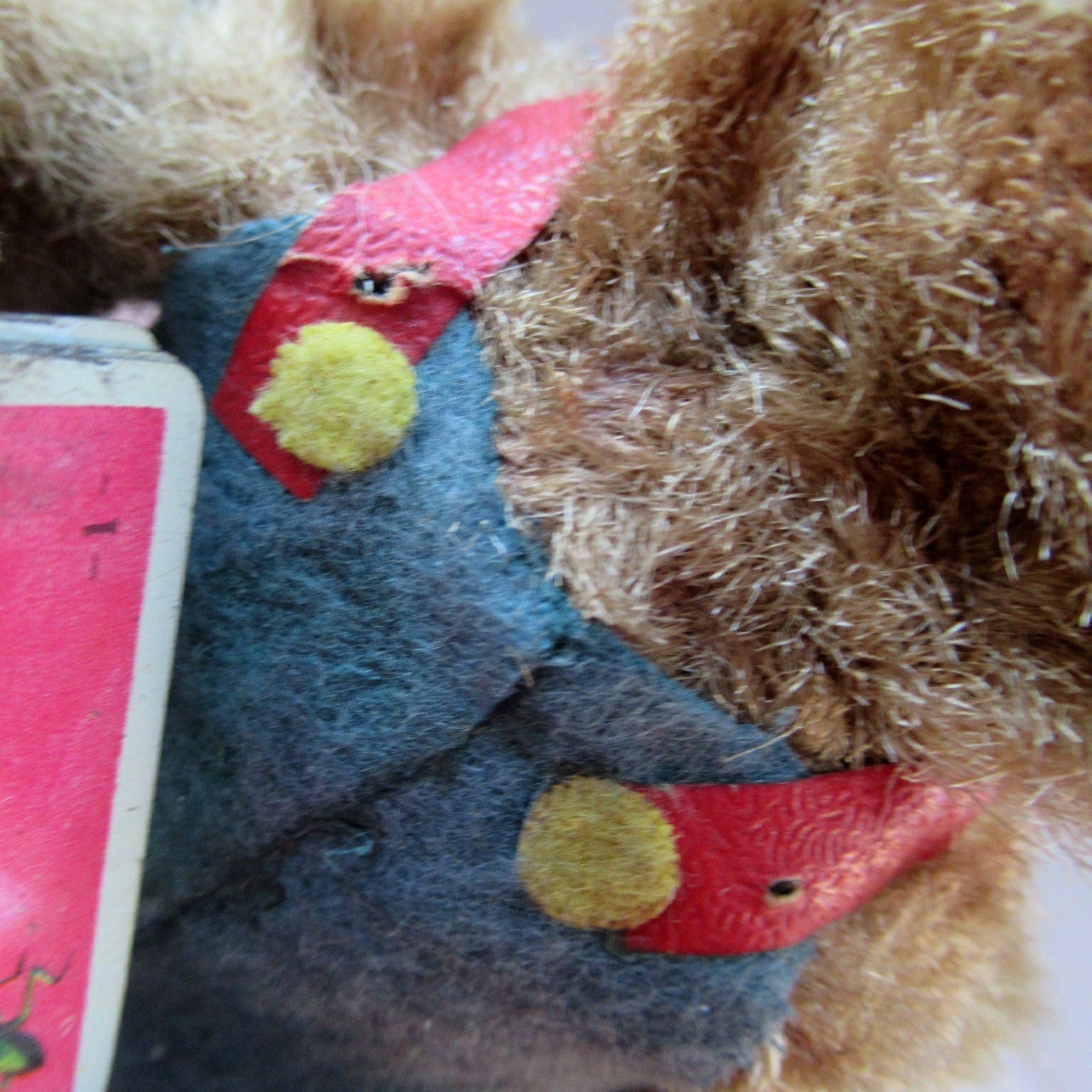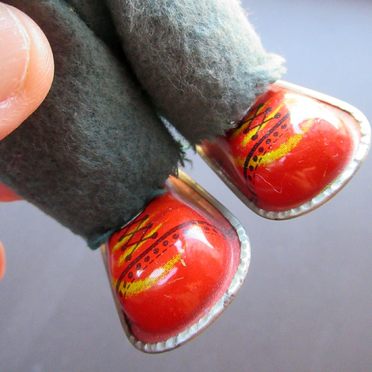 He dates to the 1950s and was made by Alps, Japan. He is made from lithographed tinplate with a plush fabric finish and cotton clothes. All lovely and clean and not shabby in any way.