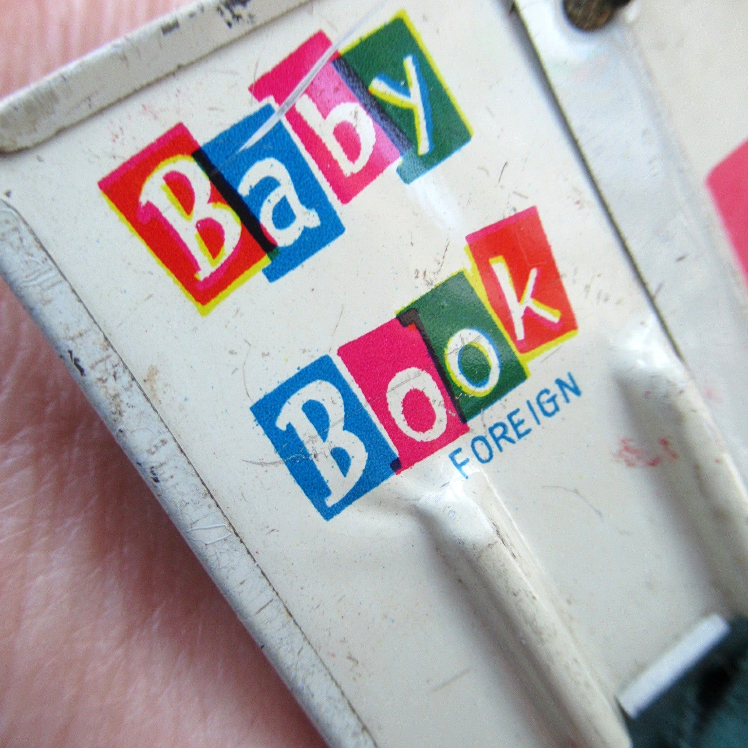 He is a light golden-brown furry bear wearing French blue felt overalls with red cloth straps. His shoes are red tin litho and have Made in Japan on the backs. Cubby is holding his tin litho book in one hand and turns the page with his other tin litho hand. The book he is reading is about animals. The pages are: Cat, Dog, Duck, Hen, Rat, Fox, Pony, Pig, and Calf.